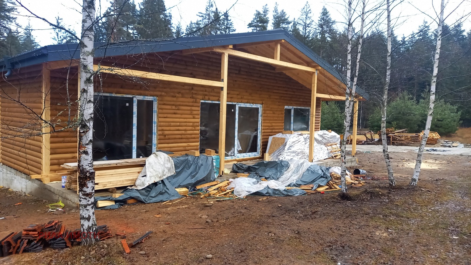 дърво / материали от Австрия / върху масивен фундамент. Фасадата е с 15 см./каменна вата /изолация, дървена обшивка , мазилка и камък върху фундамента. Отоплението е с термопомпа. Пода ще бъде с ламинат, стените готови за боя .