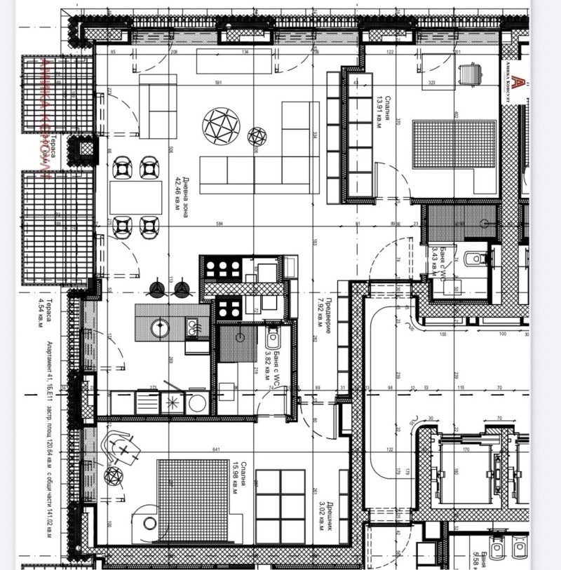 Чистата жилищна площ е 120.64кв.м. и е със следното разпределение: