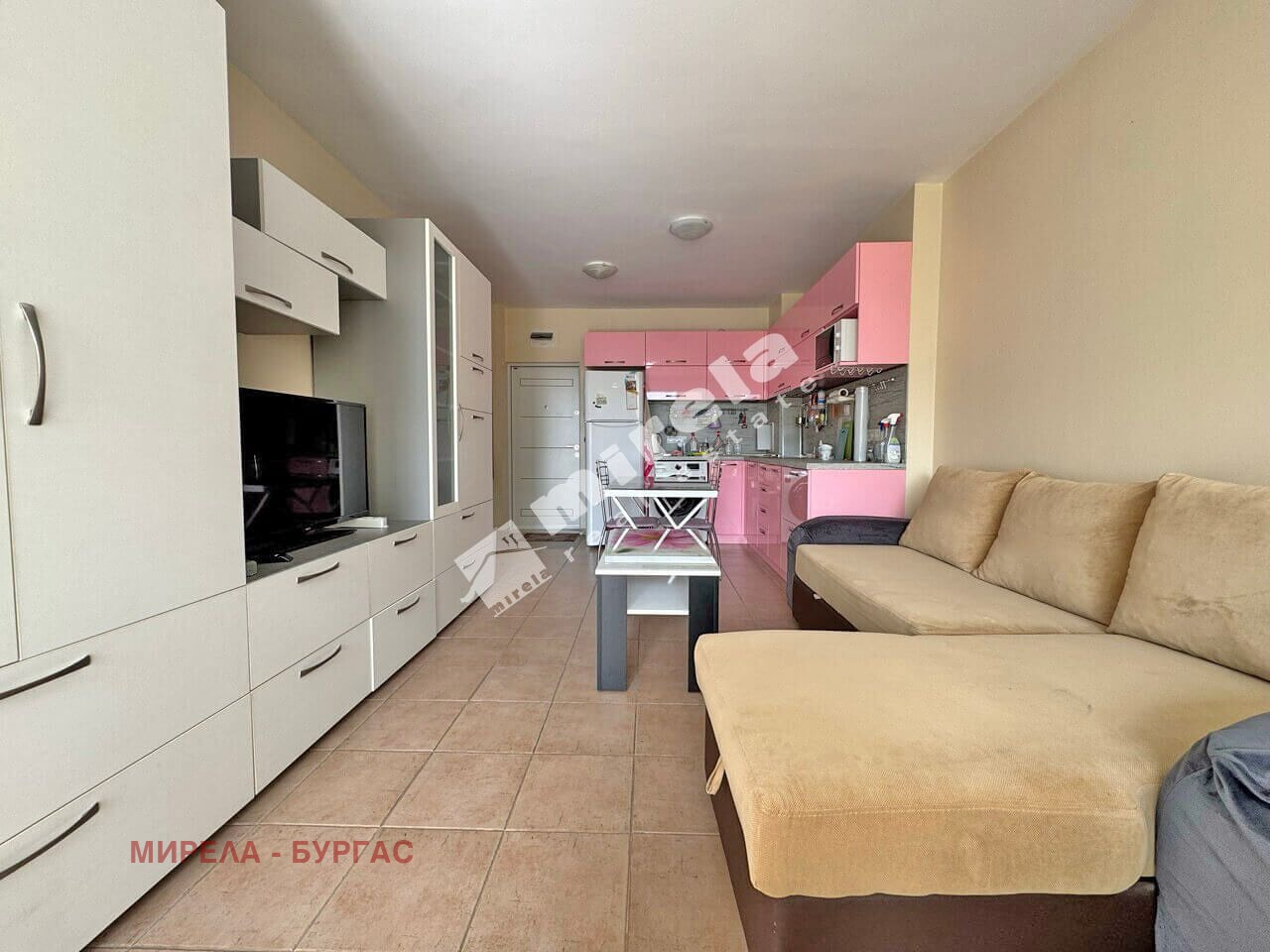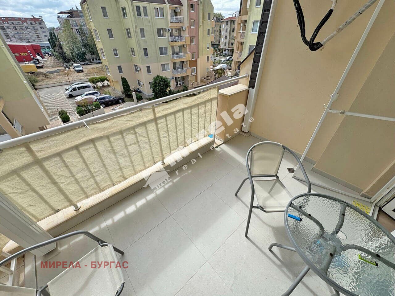 На територията на комплекса са разположени: басейн, кафе, зона за отдих, зона за барбекю, паркинг. Апартаментът е разположен на четвърти жилищен етаж с гледка към басейна, и е с разпределение: антре, просторна всекидневна с голяма кухня, една спалня, санитарен възел и тераса.