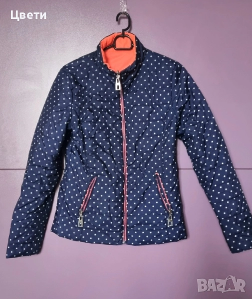 Двойнолицево яке- от едната страна е тъмносиньо на бели точки, а от другата розово, не е носено, размер М, 20 лв.