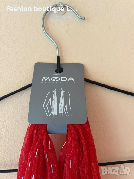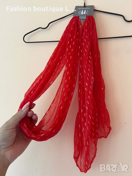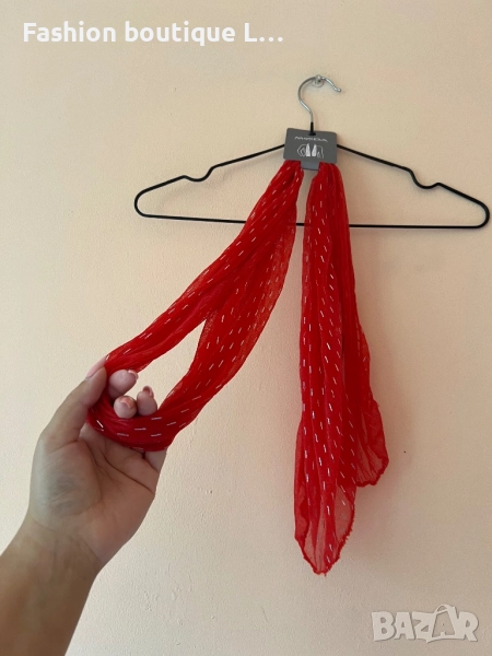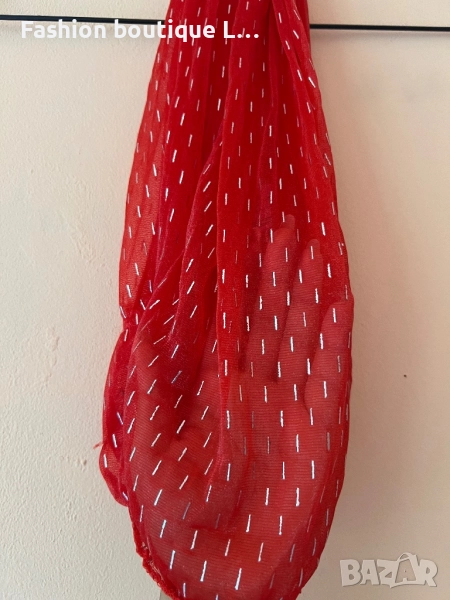 Нов червен шал с етикета със сребърни чертички като десен ❤️ → Обява 51920940
