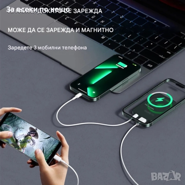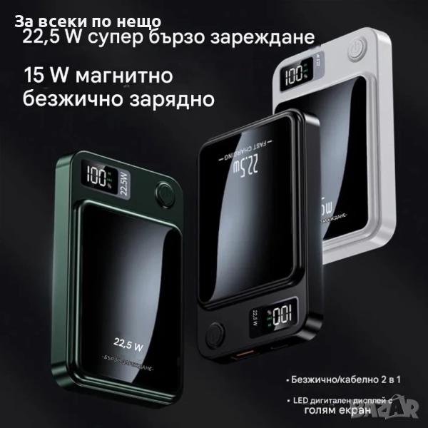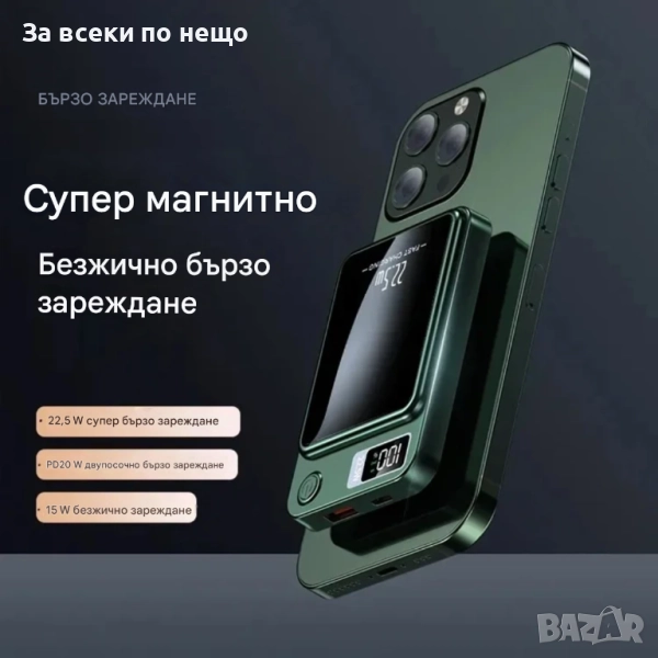 Забравете за празната батерия, където и да сте! С този мощен магнитен Power Bank с капацитет 10 000 mAh получавате надеждна енергия за целия ден. Благодарение на супер бързото зареждане 22.5W, безжичната функция и наличните Type-C и USB портове, можете да заредите няколко устройства едновременно – бързо, удобно и сигурно.