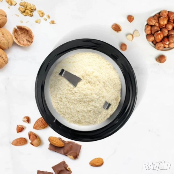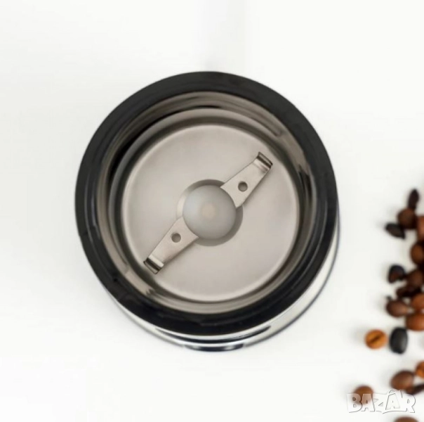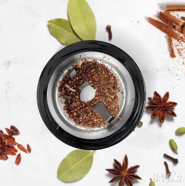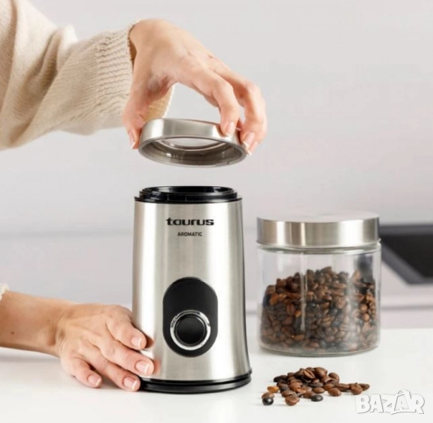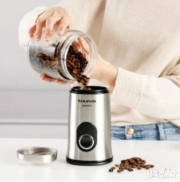 Модел: Taurus AROMATIC; Тип: Кафемелачка / мелачка за подправки; Мощност: 150W; Капацитет на контейнера: 50 г; Остриета: неръждаема стомана, високоустойчиви; Контейнер: неръждаема стомана; Капак: прозрачен – за визуален контрол на смилането; Управление: бутон за включване; Основa: противоплъзгаща; Функции: кабелно отделение за лесно прибиране; Приложение: подходяща за кафе и подправки.