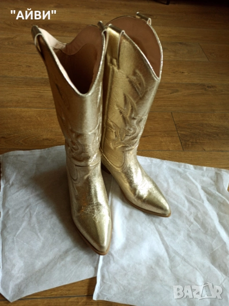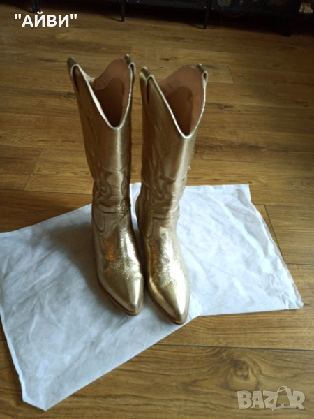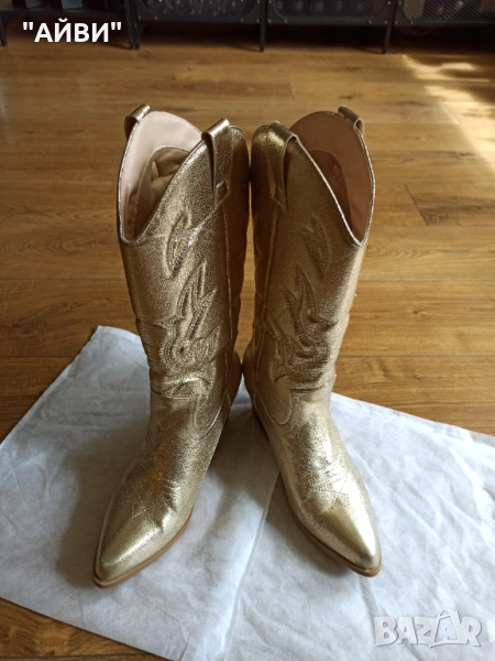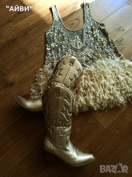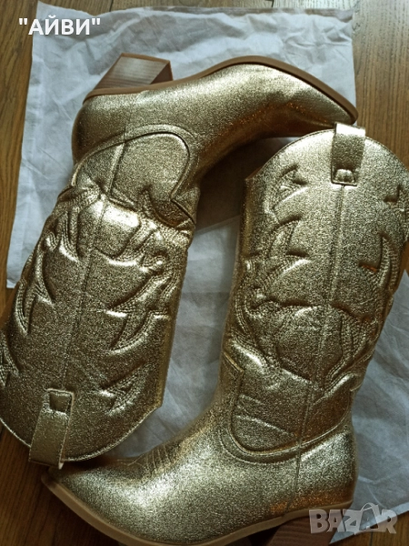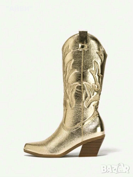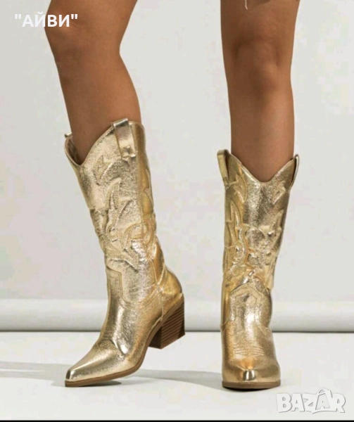 Обувани за един час. Дамски каубойски ботуши в цвят златист. Западен стил с бродерия, до средата на прасците, на средно масивен ток, с остри пръсти.