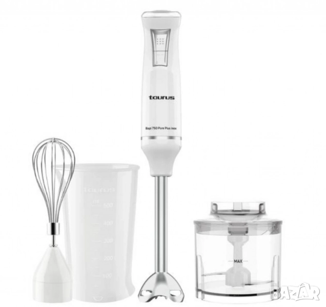 Модел: Taurus BAPI® 750 PURE PLUS INOX; Мощност: 750W; Управление: 20 скорости + Turbo функция; Система: Turbo Rotation – подобрена циркулация на храната; Остриета: Неръждаема стомана, високопроизводителни, с двоен ефект (пасиране + нарязване); Пръчка: Неръждаема стомана, подвижна, високоякостна; Дизайн: Ергономична дръжка + предпазител от пръски; Поддръжка: Подходящ за съдомиялна машина; Материали: Без BPA; Включени аксесоари: Пълен комплект (емулгатор, чопър, мерителна чаша).