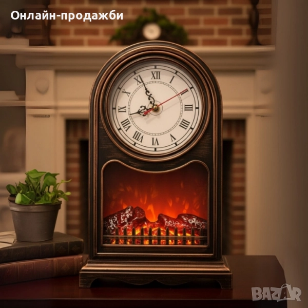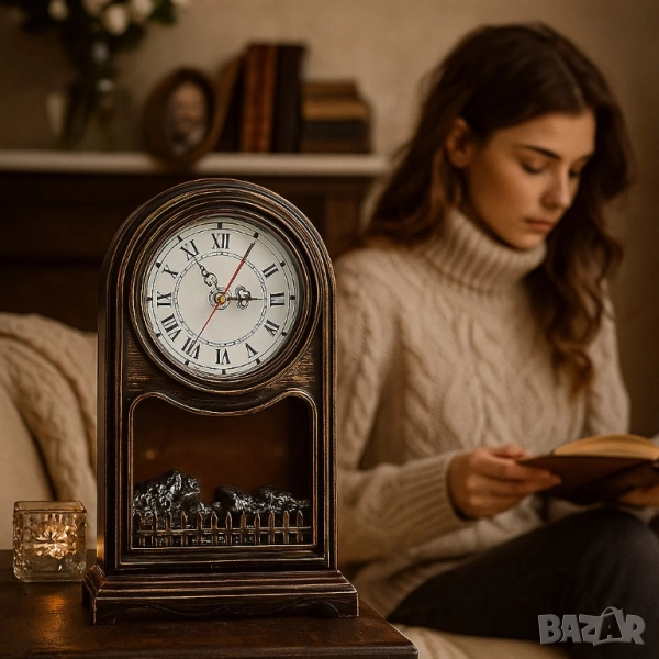 Винтидж настолен часовник с LED камина – уют и стил в едно