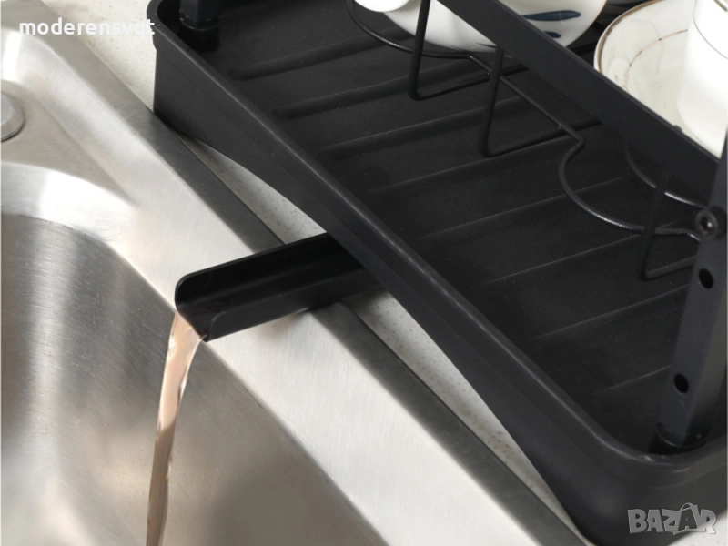 Не е нужно да се притеснявате за наводнен плот - долната тава ефективно събира водата, която капе от съдовете, а включеният улей позволява водата да се оттича непрекъснато в мивката.