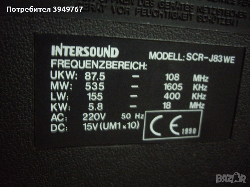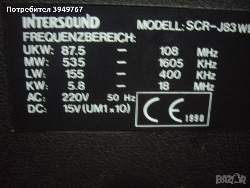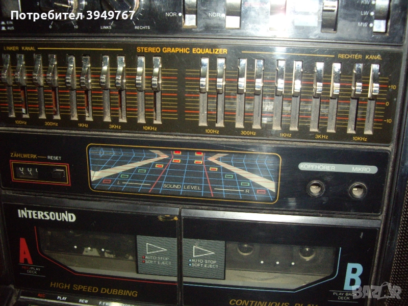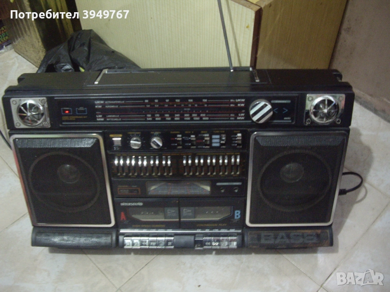 Голям двукасетъчен радиокасетофон''Intersound''Копчето за пускане на целият касетофон трябва да се заглави настрани за да се пусне.Едната касета което и да е копче като се натисне задържа но се чува едно щракане повтарящо се през определен интервал от време ,а другото гнездо си работи,както и радиото.Не е носен на майстор.Размери 63/35/12.