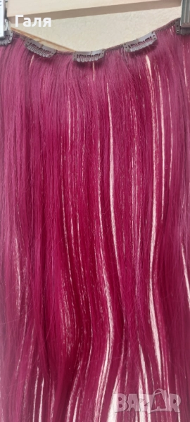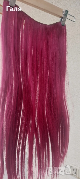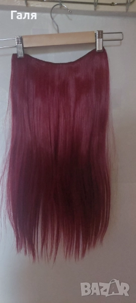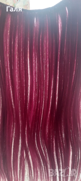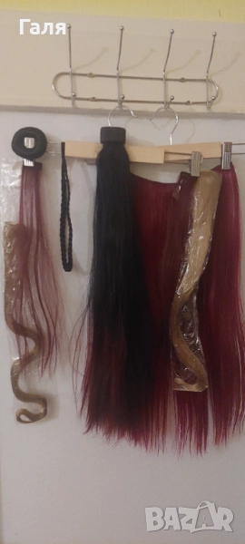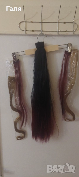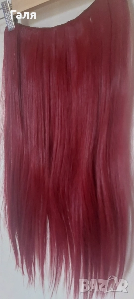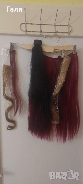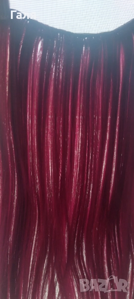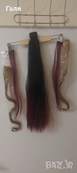 Опашка черно и червено омбре. 2 бр кичури със щипка , 2 бр. Руси кичура със щипка. 1 треса много хубав цвят червено-Бордо. Не мога точно да определя - на различнота светлина изглежда различно.