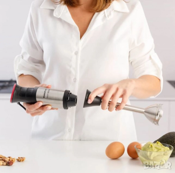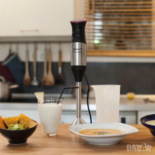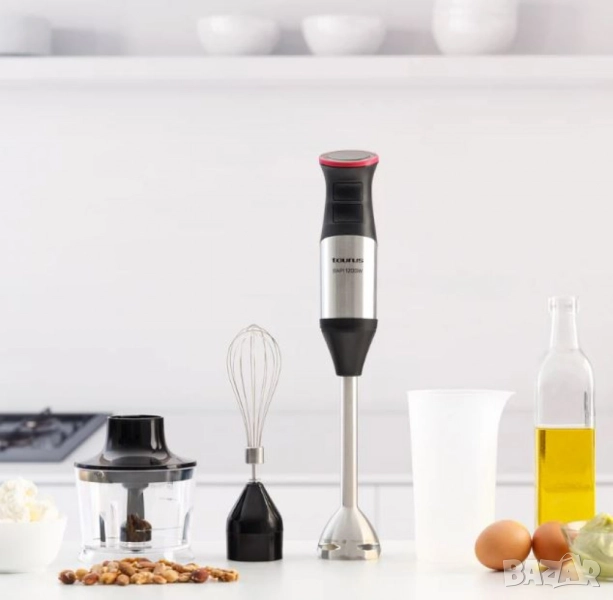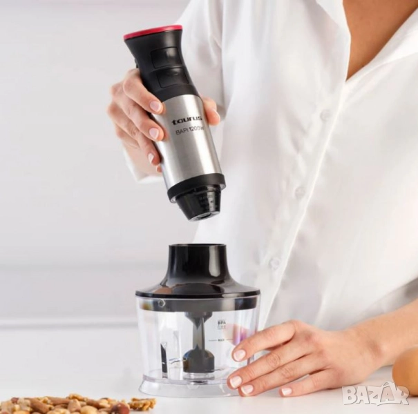 Модел: Taurus BAPI® 1200 PLUS INOX – с пълен комплект аксесоари:Мощност: 1200W;Управление: 20 скорости + Turbo функция;Система: Turbo Rotation – подобрена циркулация на храната;Остриета: Неръждаема стомана, с двоен ефект (пасиране + нарязване);Пръчка: Неръждаема стомана, подвижна;Ергономична дръжка Soft Touch + предпазител от пръски;Поддръжка: Аксесоари и пръчка, подходящи за съдомиялна машина;Материали: Без BPA;Включени аксесоари: Мерителна чаша, чопър, емулгатор.Модел: Taurus BAPI® 1200 INOX – с 1 аксесоар: