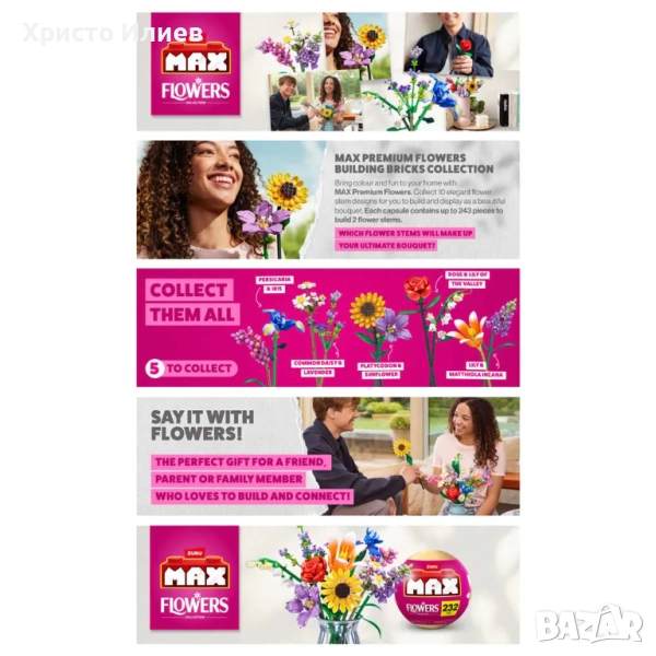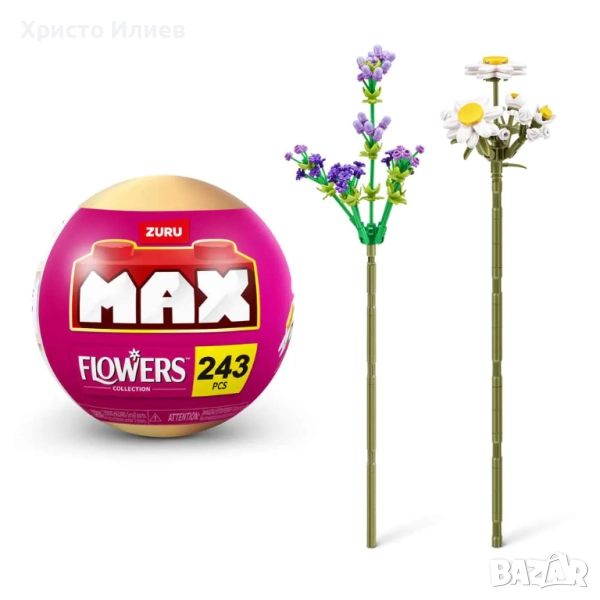 Внеси цвят и забавление в дома си с MAX Premium Flowers. Събери 10 елегантни дизайна на рязан цвят, които да сглобиш и покажеш като красив букет. Всяка капсула съдържа до 243 части за сглобяване на 2 сложни и красиви цветя. Има 5 различни капсули с 10 различни цветя за събиране. Във всяка капсула има по 2 цветя, включително: лилия и шибой (Матиола Инкана); персикария и ирис; платикодон и слънчоглед; обикновена маргаритка и лавандула и роза и момина сълза. От какво ще се състои любимия ти букет?