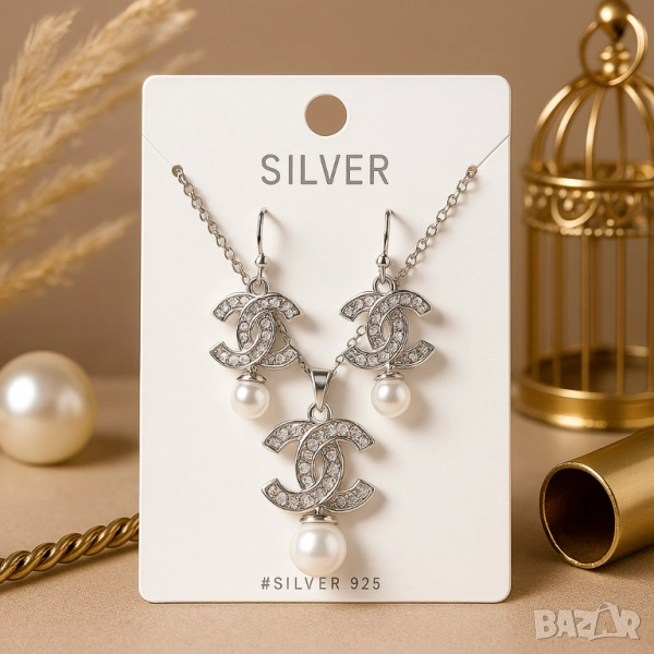Луксозен сребрист комплект бижута с перли - колие и обеци/ устойчив метал chanel