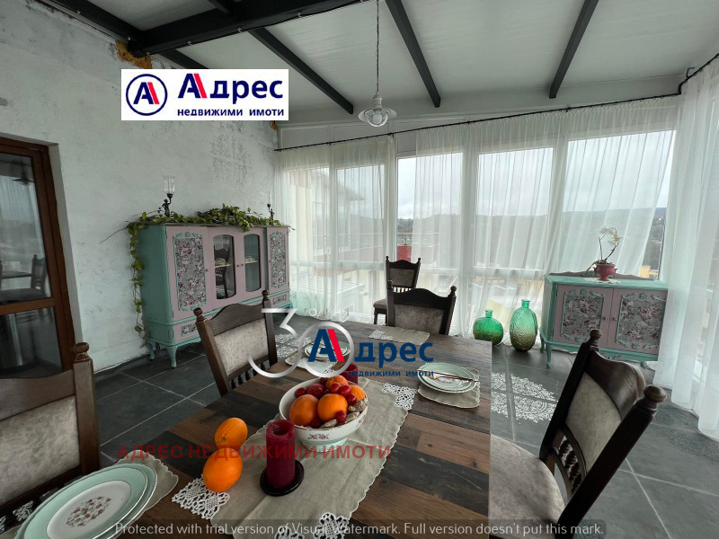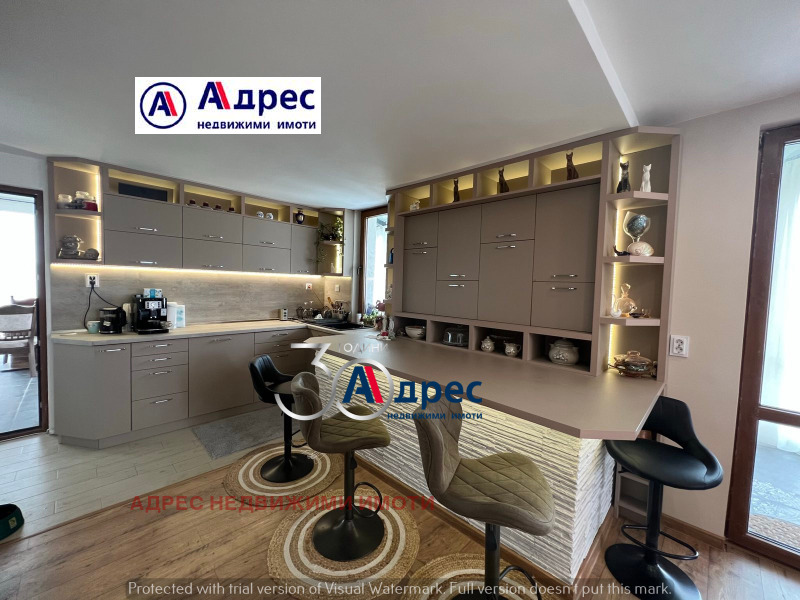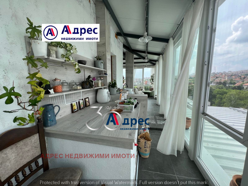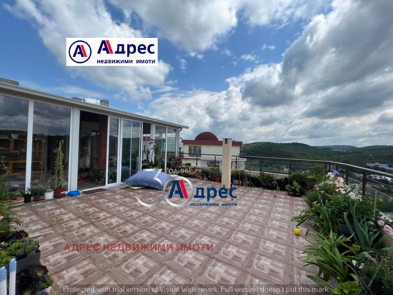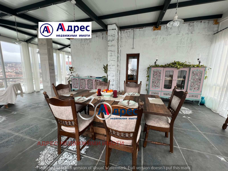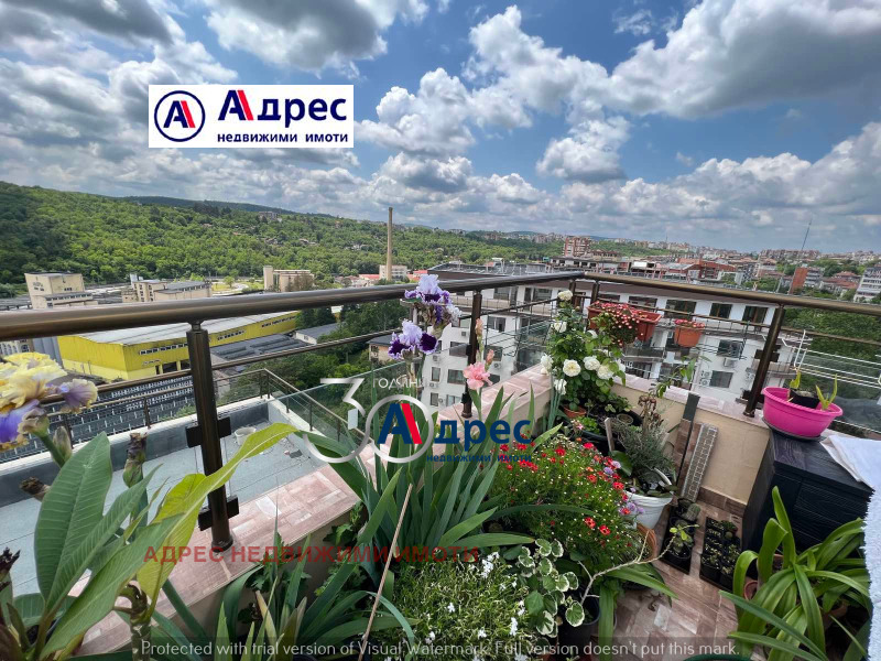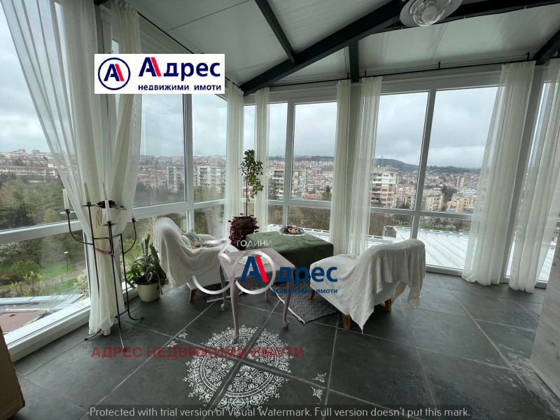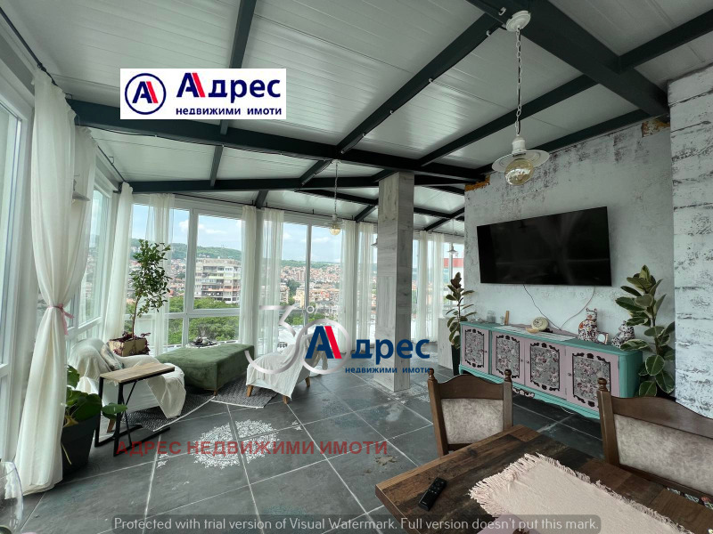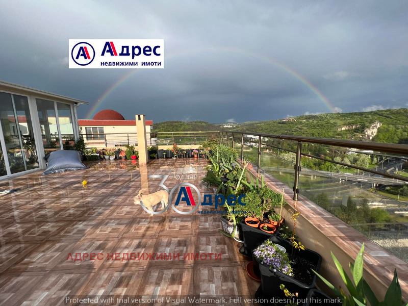 Луксозен тристаен апартамент. Адрес Недвижими имоти продава стилен тристаен апартамент в центъра на гр. Велико Търново, в близост до парк 'Дружба'. Апартаментът се намира в тухлена сграда, ново строителство, с Акт 16, на 7-ми последен етаж - като в сградата има работещ асансьор. Общата площ на имота е 220 кв.м. разпределени по следния начин: чиста жилищна площ - 76,3 кв.м., стълбище - 10 кв.м., тераси - 133 кв.м. Жилището се състои от коридор, просторна всекидневна с кухненски бокс, две спални, баня с тоалетна, килер и две панорамни тераси /едната от която документално е остъклена и обособена като просторен хол, има и изводи за кухня/. Продава се напълно обзаведено с всички необходими електроуреди. Има допълнителна възможност за преустройство на апартамента - което позволява и покупка с инвестиционна цел. Има възможност за закупуване на гараж.