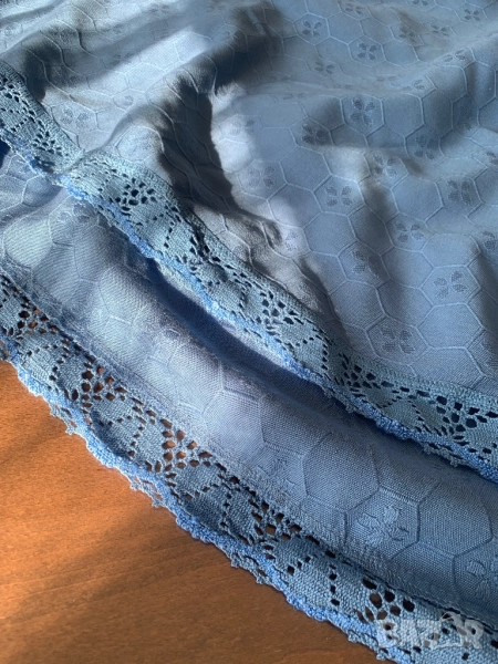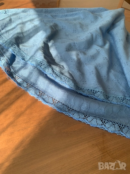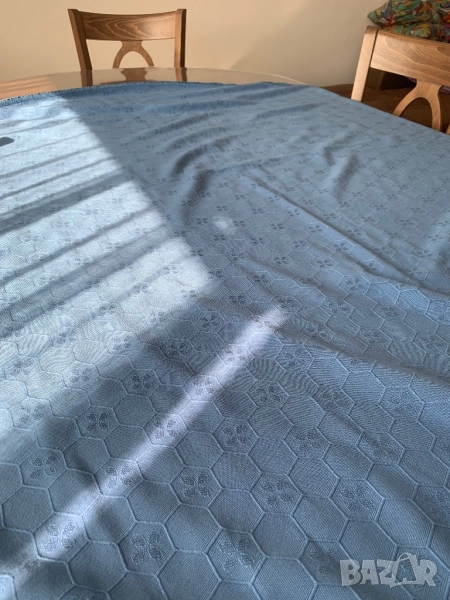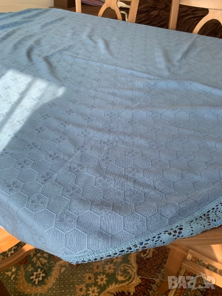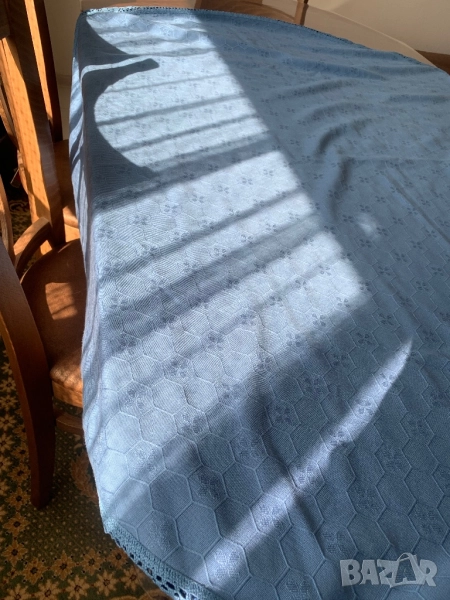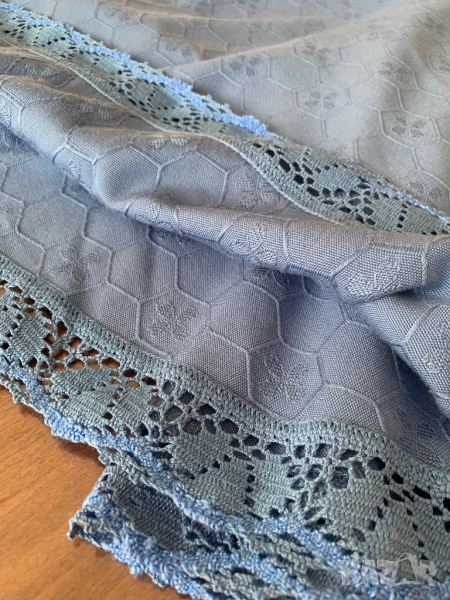 Покривка за кръгла маса с дантела. Диаметър на покривката 155 см. Ширина на дантелата 3,8 см. Красив син цвят, който не се вижда на снимките. В действителност е по-хубава от на снимките. Покривката е ползвана, но е без забележки.