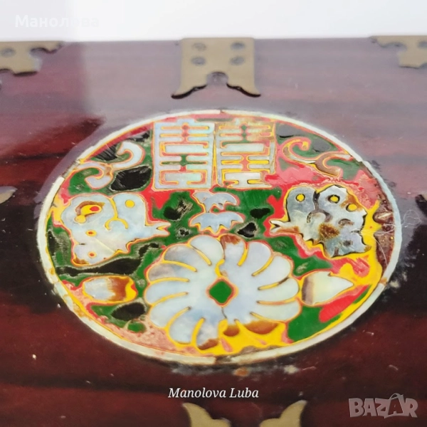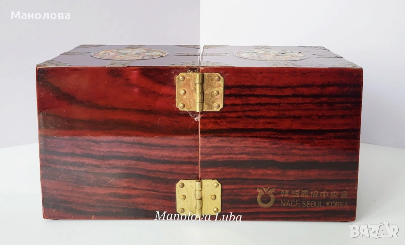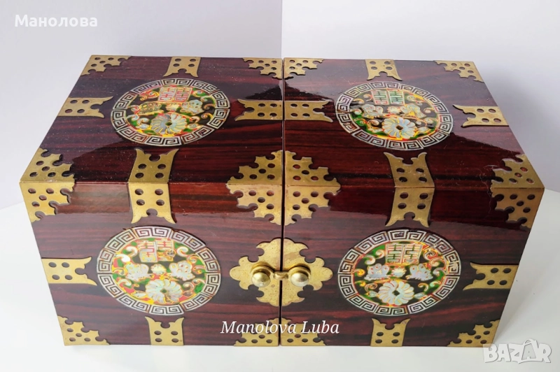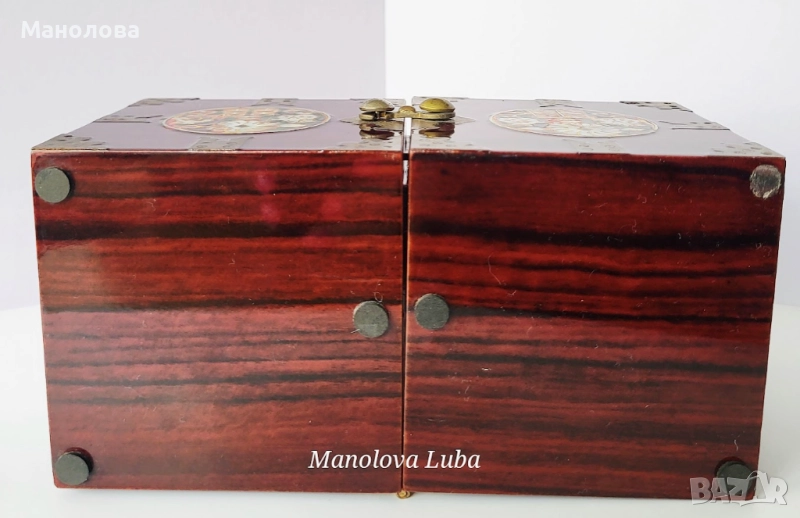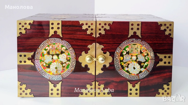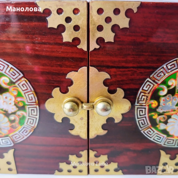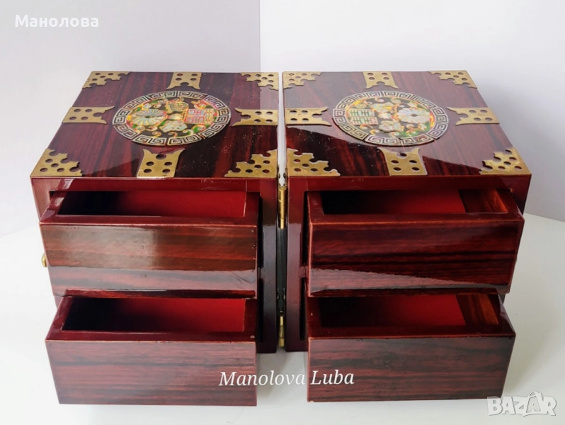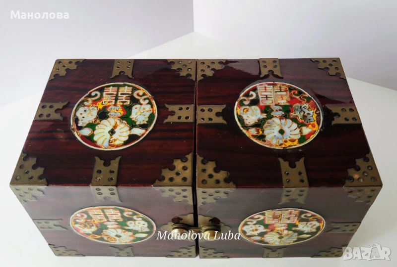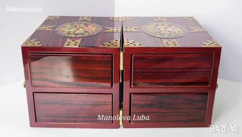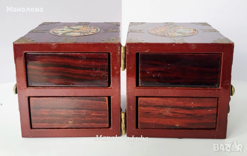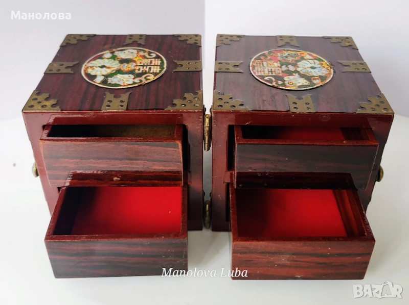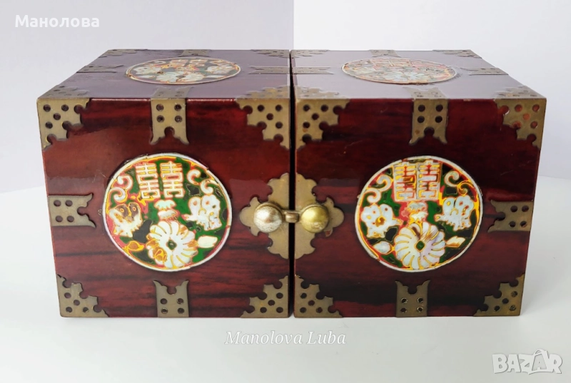 Тази винтидж корейски лакови кутии за бижута са повече от просто място за съхранение - те са смесица от културна елегантност, сантиментална красота и функционален дизайн. Ръчно изработени в рядка двойна кубична структура, разполагат с по четири малки чекмеджета, предно закопчаване, месингов обков. Богато украсените емайлирани медальони показват мотив лотос с инкрустация от седеф, символизиращ мир, обновление и вътрешна хармония в източноазиатската традиция. Завършени с дълбок, лъскав лак и богати детайли, тази кутии са смислено допълнение към всеки тоалетен шкаф, скрин или колекционерски рафт. Много добро винтидж състояние, моля разгледайте снимките!