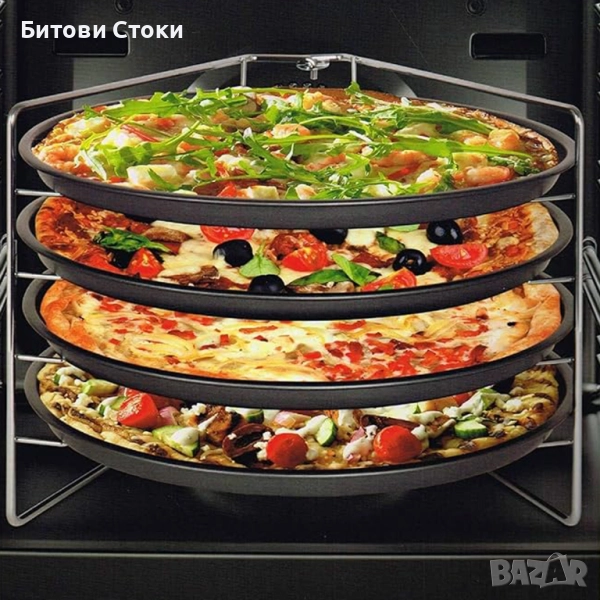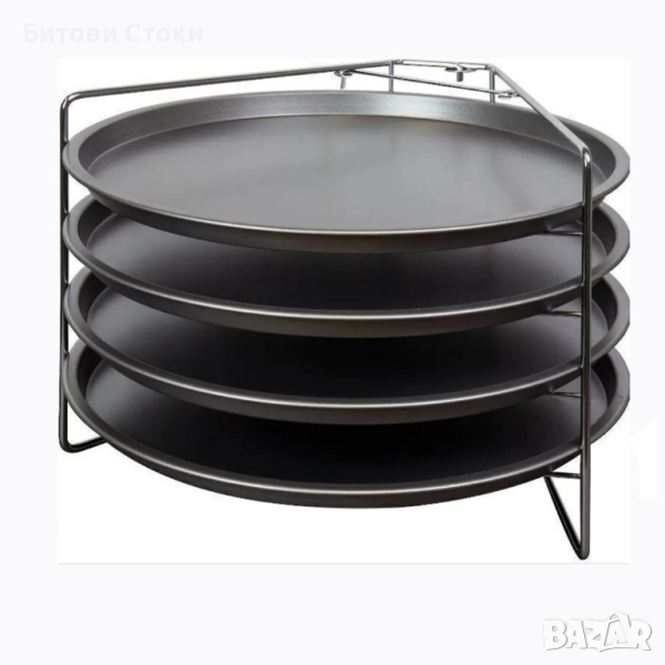 Предлагаме комплект за печене на пици от 5 части. Внос от Германия на фирма Dario GmbH & Co Hamburg Германия. Идеален за любителите на пица, които искат да приготвят няколко пици едновременно. Комплектът включва четири тави за пица с диаметър приблизително 29 см и практична стойка за компактно съхранение и удобна работа във фурната. Печете до 4 пици или тарт фламбе наведнъж – идеално за семейства и партита.