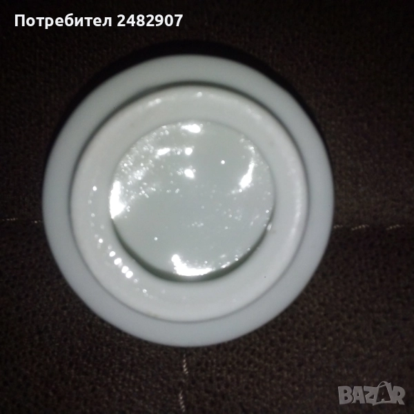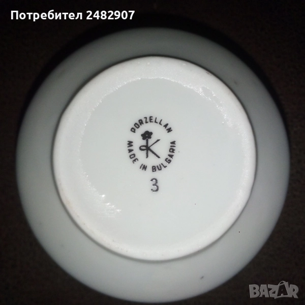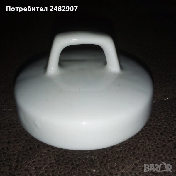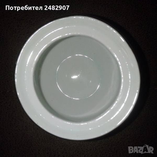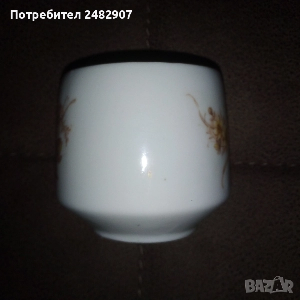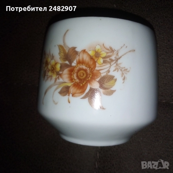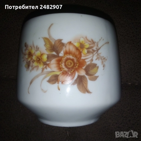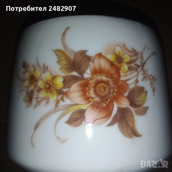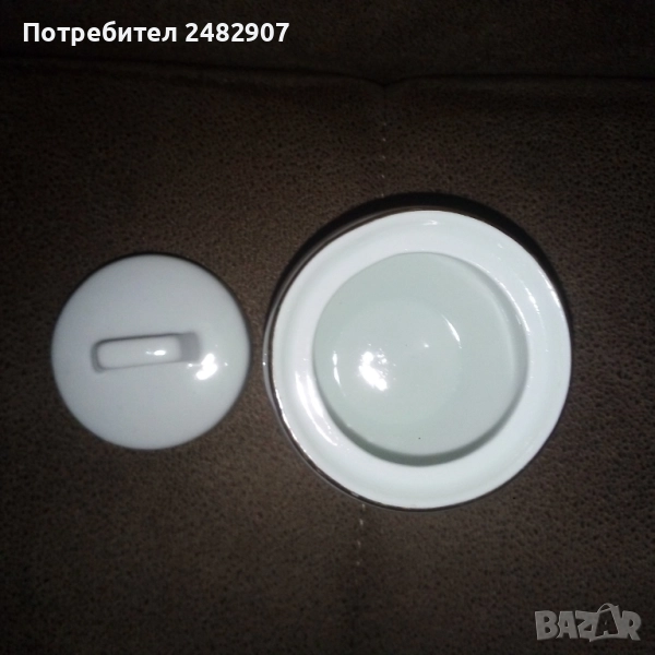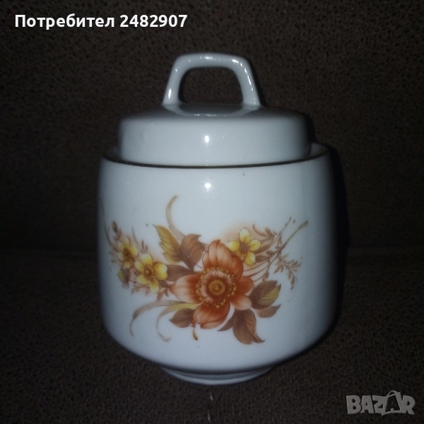 Красива стара порцеланова захарница, българско производство. Диаметър в долната част - 4,5 см, диаметър в горната част - 7 см, височина от долната част до горната част на капачето - 10 см. Чисто нова, не е използвана, без забележки, със златен кант в горната част.