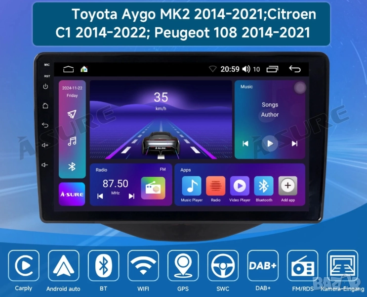 Wi-Fi интернет, новият Андроид, Bluetooth за разговори и музика, USB входове за флашка и зареждане на устройства, GPS навигация, теми за вид на меню, еквалайзер за настройка на звука, бърза реална RAM памет от ново поколение. ТОП дизайн!