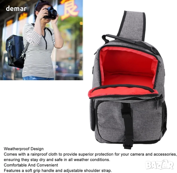 Тази чанта за фотоапарат е изработена с водоустойчив дизайн и дъждоустойчива материя, за да предпази оборудването и да остане сухо, а здравият ѝ EVA материал осигурява издръжливост и дълъг експлоатационен живот. Тя предлага комфорт чрез мека дръжка и регулируема презрамка, с двойни ципове за лесен достъп. Вътре, подвижни разделители позволяват персонализирана организация или превръщане в многофункционална чанта за пътуване. Страничен отвор осигурява бърз достъп до екипировка, а L-образният преден джоб удобно съхранява ежедневни неща.