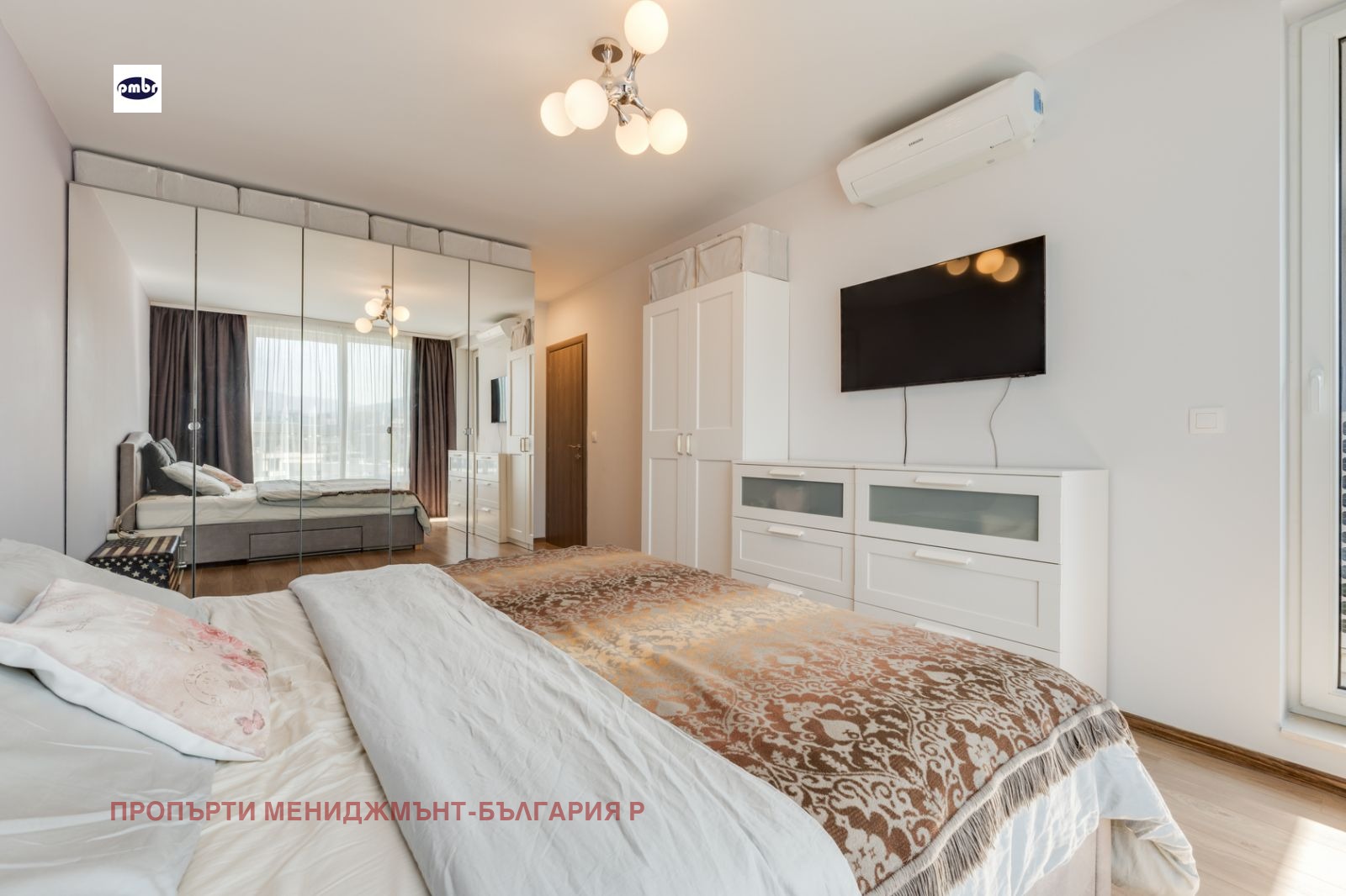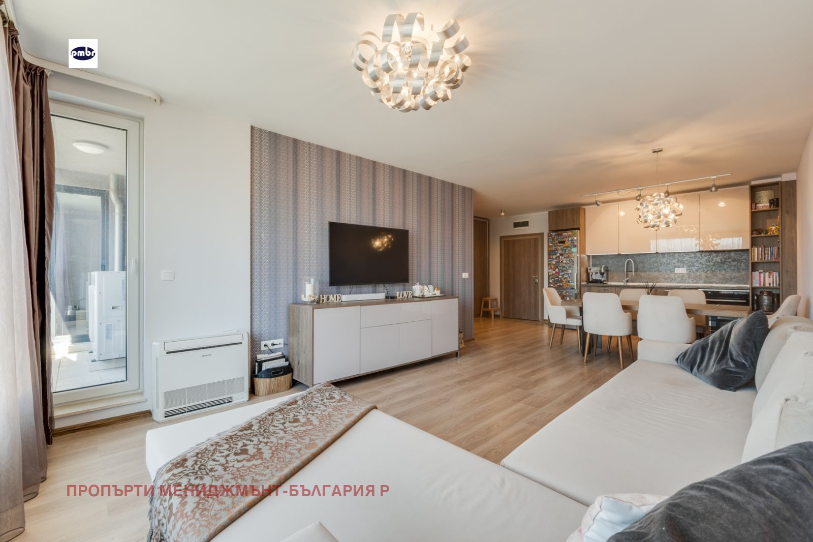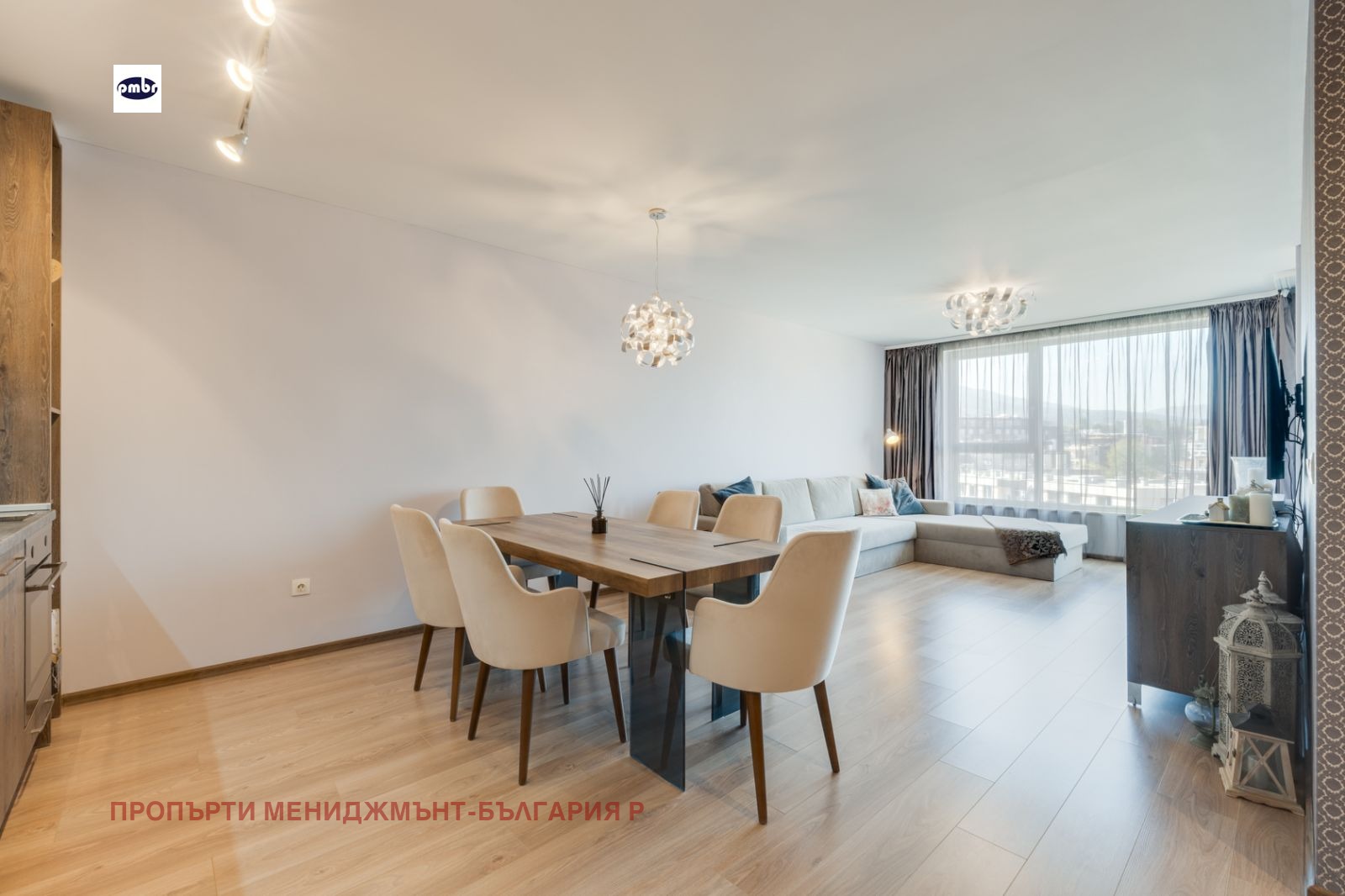 Има допълнителни шумо и звуко-изолации на таван и външни стени със съседите. Пред него се разкрива чудесна гледка към планината. Намира се в малък затворен комплекс с охрана и видеонаблюдение с детски площадки и много стриктен достъп. Всички стаи са обърнати на юго-запад. Просторен хол с кухня, голям гардероб-мокро, родителска спалня с баня и тоалетна към нея, втора спалня, втора баня и тоалетна, тераса с чудесна гледка. Отоплението и охлаждането е с висок клас инвенторен климатик-тип термопомпа с много ниски сметки за ток. 490 000 евро, 115 кв.м. , отопление на ток, 6 от 6 ет. Напълно обзаведен, асансьор, жива охрана и видеонаблюдение и допълнителна външна охранителна фирма към целия комплекс, достъп с чип.