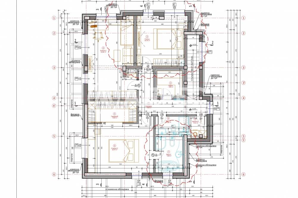 - Завършена фасада по проект с каменни и дървени облицовки