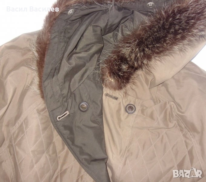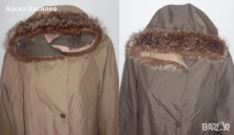 Дамско шушляково палто двулицево бежаво кафяво с качулка естествен косъм → Обява 51931320