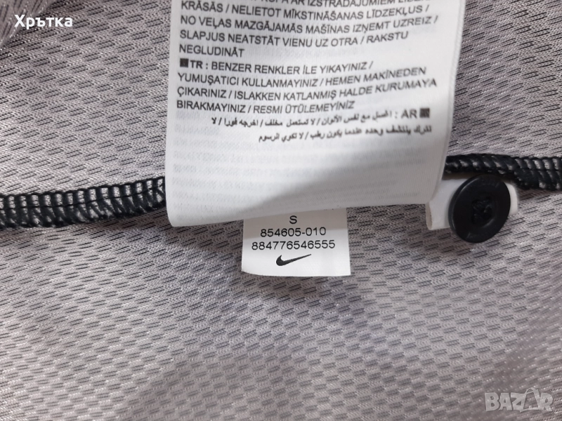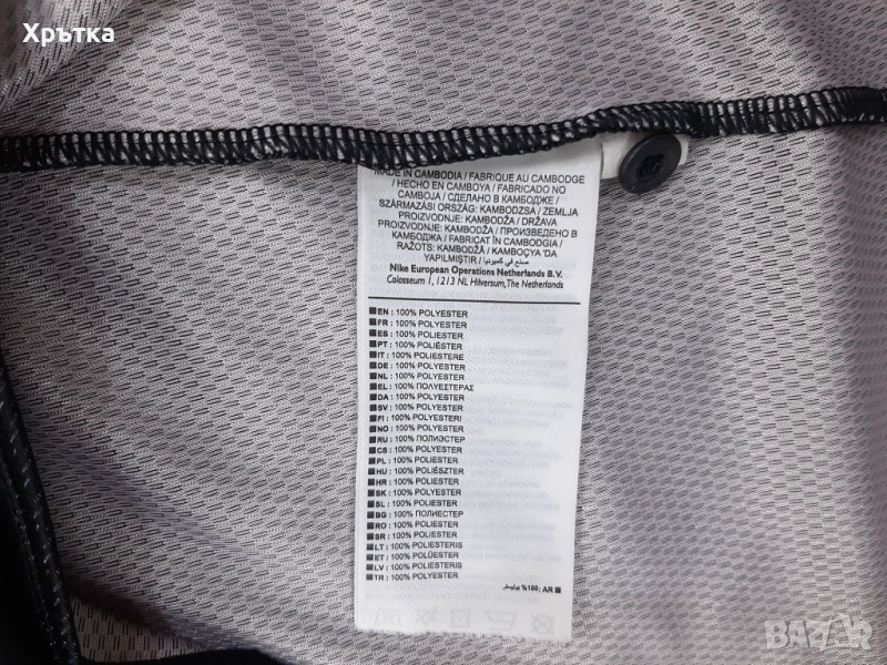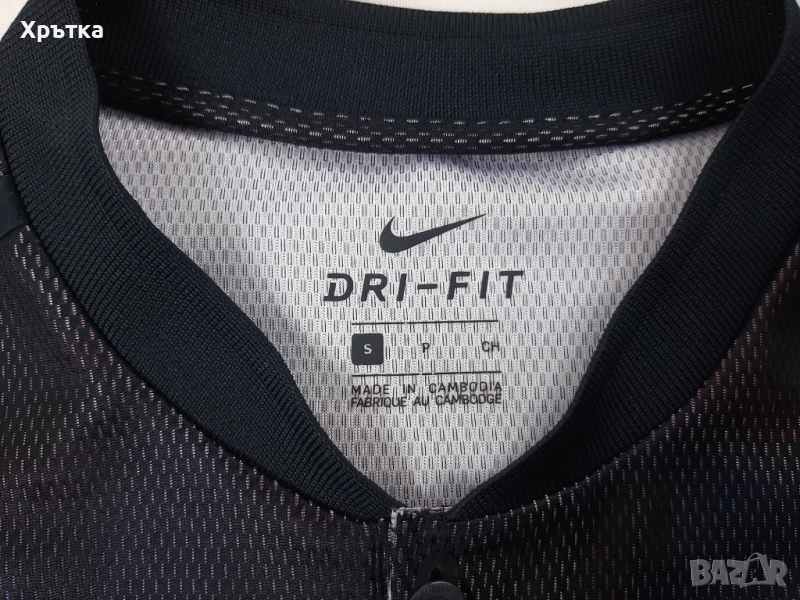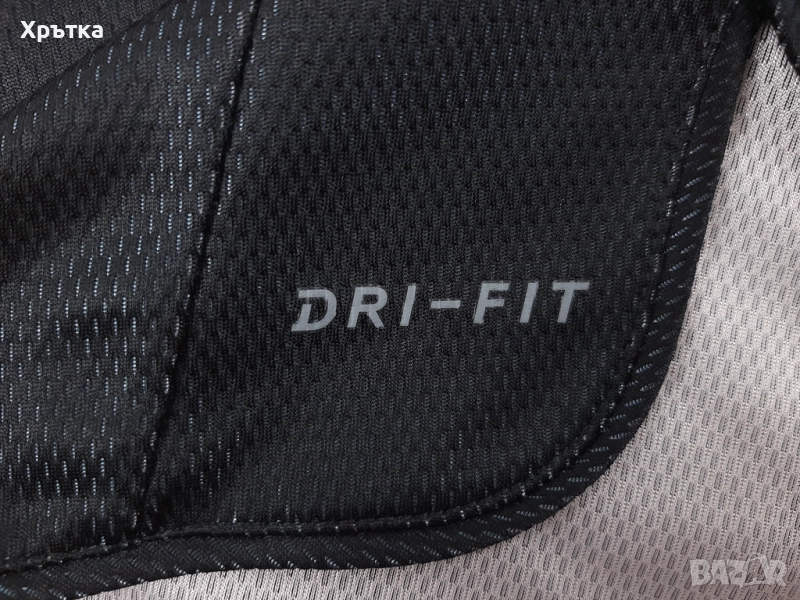 Dri-FIT ADV технология – усъвършенствана влагоотвеждаща система с зонирана вентилация и гладка, еластична структура Материята има фино текстурирана повърхност, която променя визуалния си ефект според светлината и ъгъла на гледане — създава усещане за преливащ блясък, без да е лъскава.