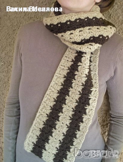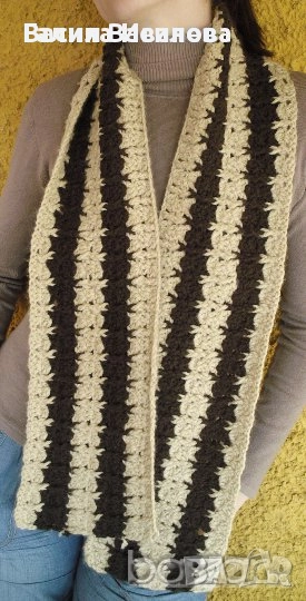 Ръчно плетен дамски шал кафяво и бяло, снимка 1 - Шапки - 51932484 Ръчно плетен дамски шал кафяво и бяло, снимка 2 - Шапки - 51932484 Ръчно плетен дамски шал кафяво и бяло, снимка 3 - Шапки - 51932484 1/3