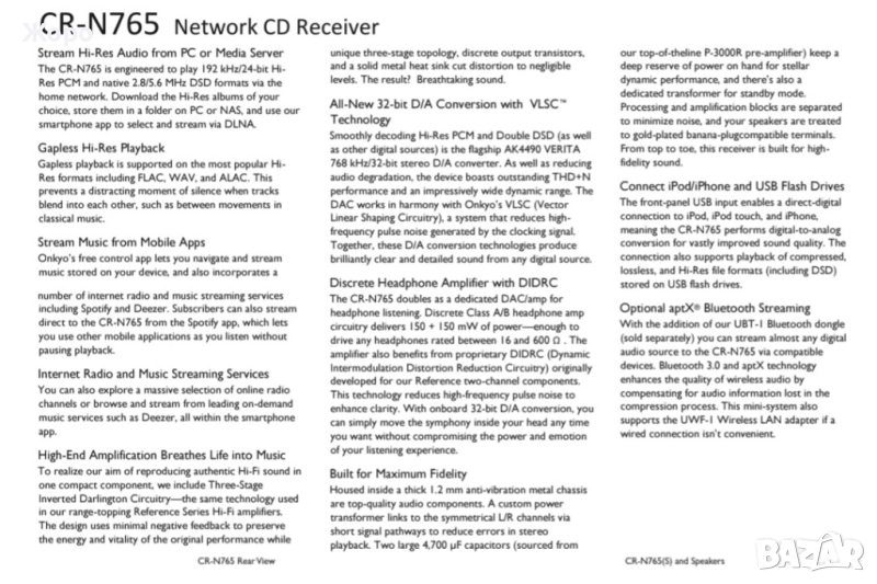 Това е първата версия за Германия, с редкият премиум ДАК AK4490R Verita Velvet 32bit/768kHz - DSD256, познават се по ореола на копчето и по надписа отзад. Следващата глобална версия с гладкото копче е вече със стандартният AK4490. Разликите между двата ДАКа ще намерите в сайта на Asahi Kasei. На двата USB порта свири флашки / хард дискове с DSD2.8/DSD5.6/DSF64/DSF128, FLAC WAV ALAC 24bit/192kHz, Vorbis, OGG, APE, WMA, MP3, AAC и други, вградени Optical / Coaxial входове 24bit/192kHz, LAN интернет с DLNA, Spotify, Deezer, Aupeo, Apple, интернет радиа и мн други. Три входа за аналогови източници Line 1, Line 2, AUX, както и Stereo Pre Out + Subwoofer Out. FM radio, CD player CD/CDRW/MP3/WMA.