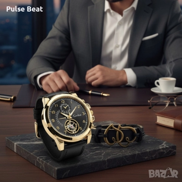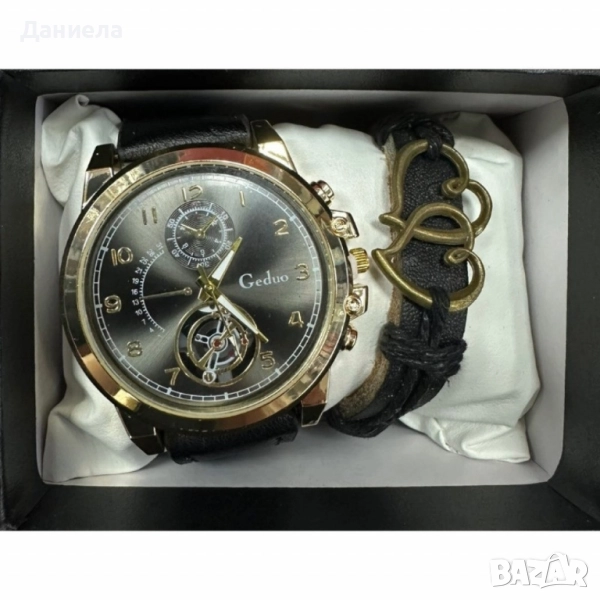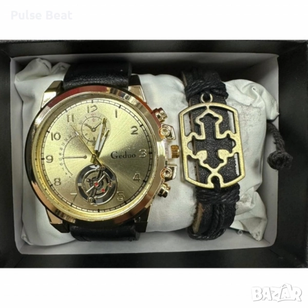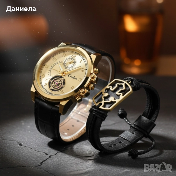 Тип продукт: Мъжки комплект – аналогов ръчен часовник + гривна; Маркировка на циферблата: „Geduo“ (видимо на снимката); Корпус на часовника: Метална сплав, златисто покритие; Циферблат: Златист; арабски цифри; декоративен прозорец „open-heart“ при 6 часа; мини-скала при 12 часа; Каишка: Черна еко кожа; класическа катарама; Гривна: Черни връзки/шнур с метален елемент – щит с кръст; Размер/пасване: Универсален; каишката и гривната позволяват корекция според китката; Поддръжка: Пази от вода, парфюм и козметика; почиствай със суха мека кърпа; съхранявай в кутията; Приложение: Ежедневие, офис, официални поводи; подходящ и като готов подарък; Цвят: Черен, златист.