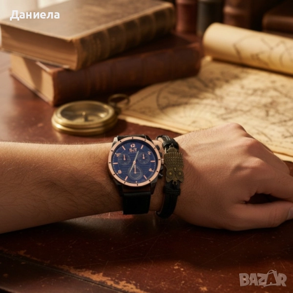 Мъжки часовник + кожена гривна (подаръчен комплект); Марка: S&T – Seek Time; Пол: Мъже; Форма: Кръгъл; Стил: Ежедневен; Повод: Всекидневна употреба; Водоустойчивост: Не е водоустойчив; Дисплей: Аналогов, смесена скала; Детайли: Декоративни хронографи, елементи тип камъче кристал; Корпус: Цинкова сплав; Каишка: PU кожа, цвят черен; Стъкло: Синтетично; Допълнителен аксесоар: Кожена гривна (два варианта – със сърца или със сова); Тип: Ръчен часовник; Опаковка: Подаръчна кутия. С елемент на Бухал С елемент на Сърца