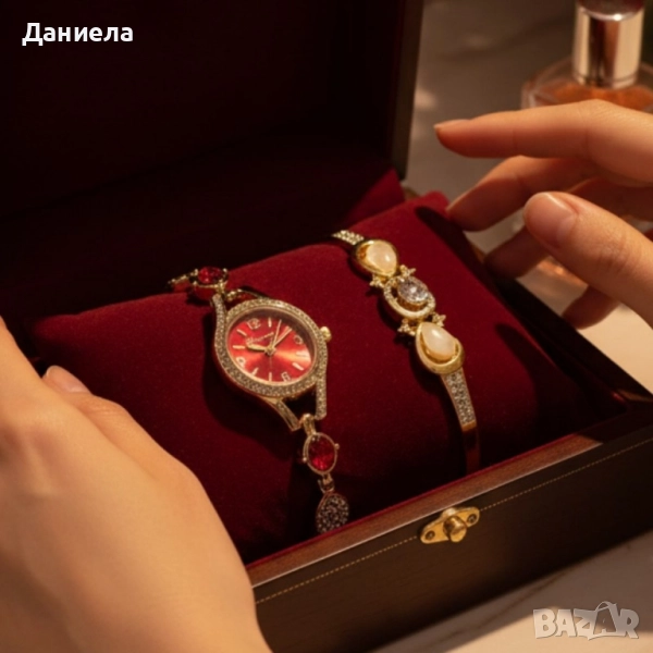 Тип: дамски комплект часовник + гривна; Механизъм: аналогов; Корпус и каишка: метал в златист тон с инкрустирани кристали; Цвят на циферблата: червен или розов; Маркери: четими индекси/цифри; Гривна: дизайн според наличността; Закопчаване: тип гривна, лесно за поставяне; Комплектът включва: часовник, гривна, подаръчна кутия.