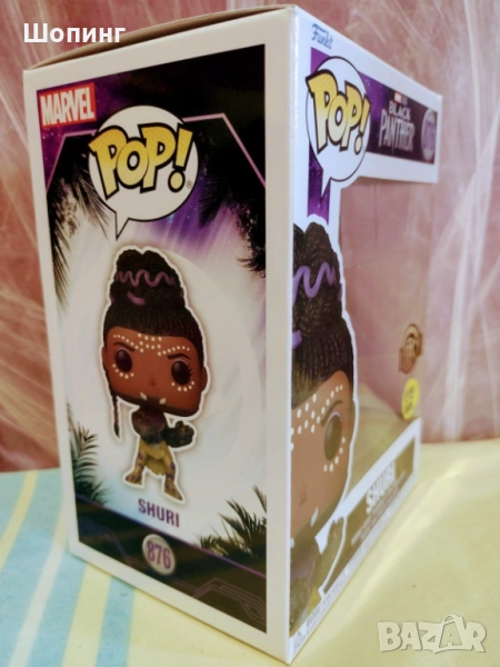 - Фигура Funko POP! Marvel: Black Panther - Shuri (Diamond Collection) (Special Edition) - Чисто нова в оригинална опаковка много рядка от диамантената колекция, специална серия. Ето я и смелата принцеса на Уаканда - Шури, която изглежда невероятно в изключително модерния си лилав костюм. Тя е по-малката сестра на Т'Чала, по-известен със супергеройското си име Черната пантера. Технологичен гений по душа, Шури се възползва добре от изобилието на редкия метал Вибраниум, за да помогне за развитието на родната си страна.