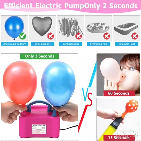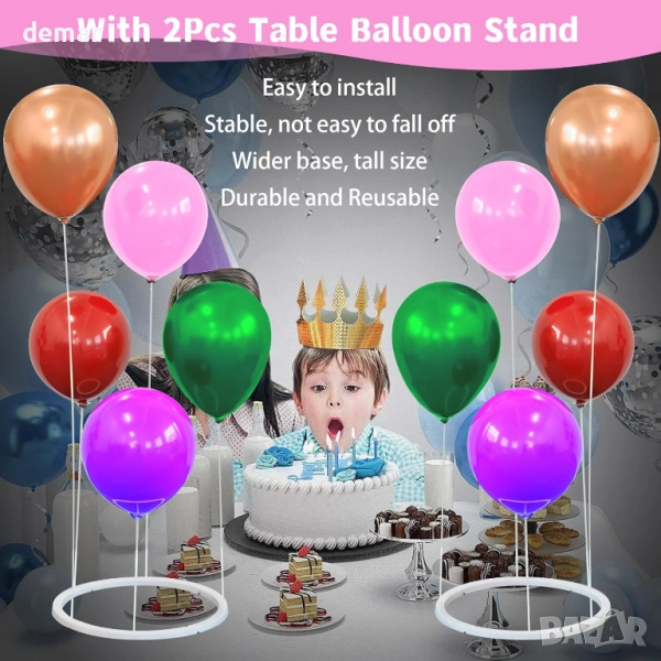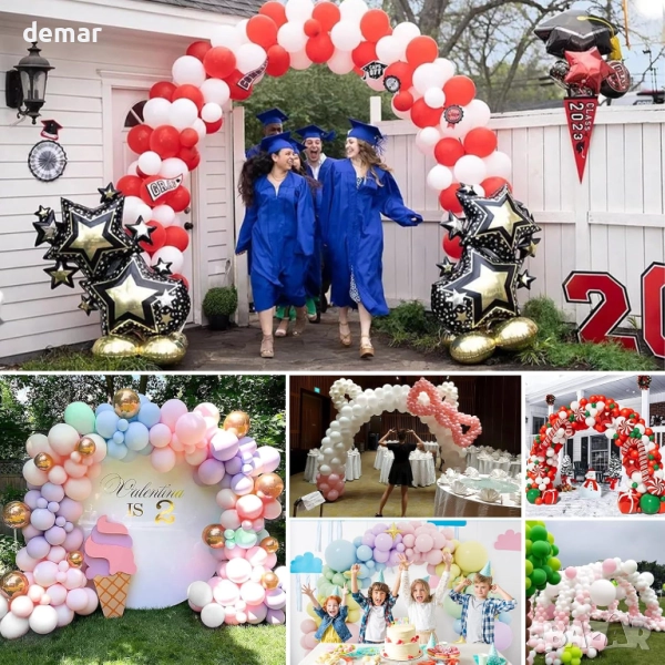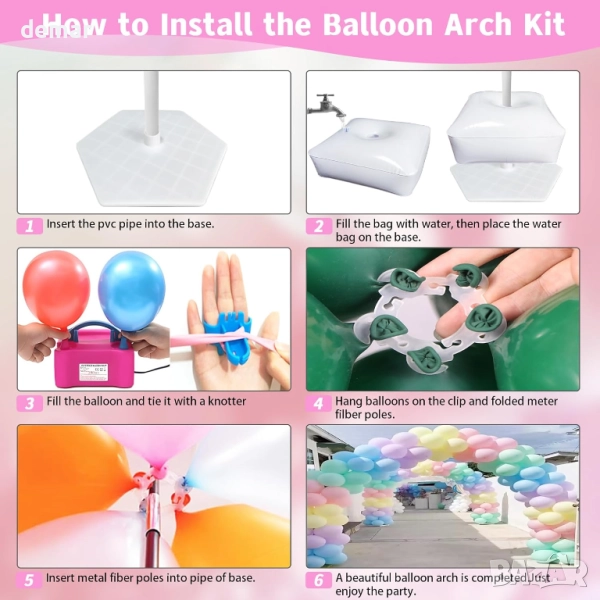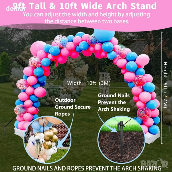 Този комплект за арка от балони включва електрическа помпа за бързо надуване, регулируеми стойки за лесно сглобяване и пълен комплект щипки, вериги, панделки и аксесоари за създаване на арки с различни размери. Той разполага със стабилна основа с водни торбички, въжета и шипове за безопасна употреба на закрито или на открито, а издръжливите фибростъклени пръчки могат да се използват многократно. Проектирана за удобство, арката може да се монтира за минути и е подходяща за декорация на рождени дни, сватби, бебешки партита, абитуриентски балове, празници и други тържества.