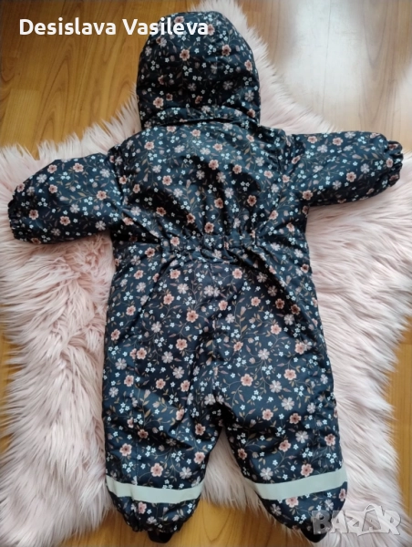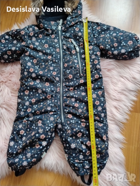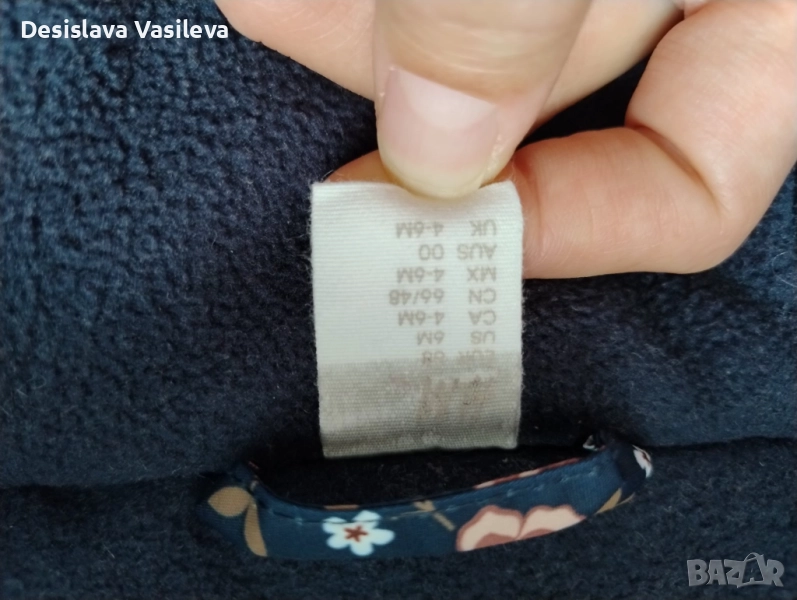 По етикет е 68 размер, но е уголемен, ноосили сме го межди 9-12 месец.