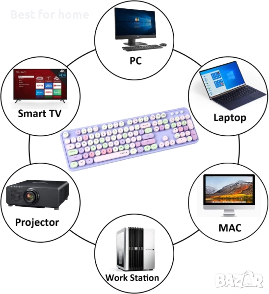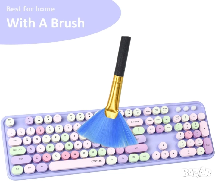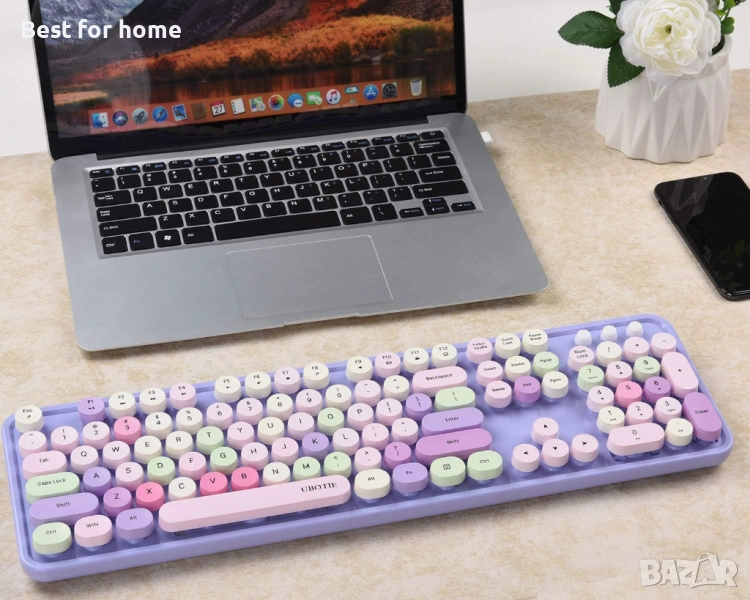 пишеща машина с гъвкави клавиши, офис клавиатура с пълен размер, 2.4GHz връзка без прекъсвания и оптична мишка (лилаво-цветно)