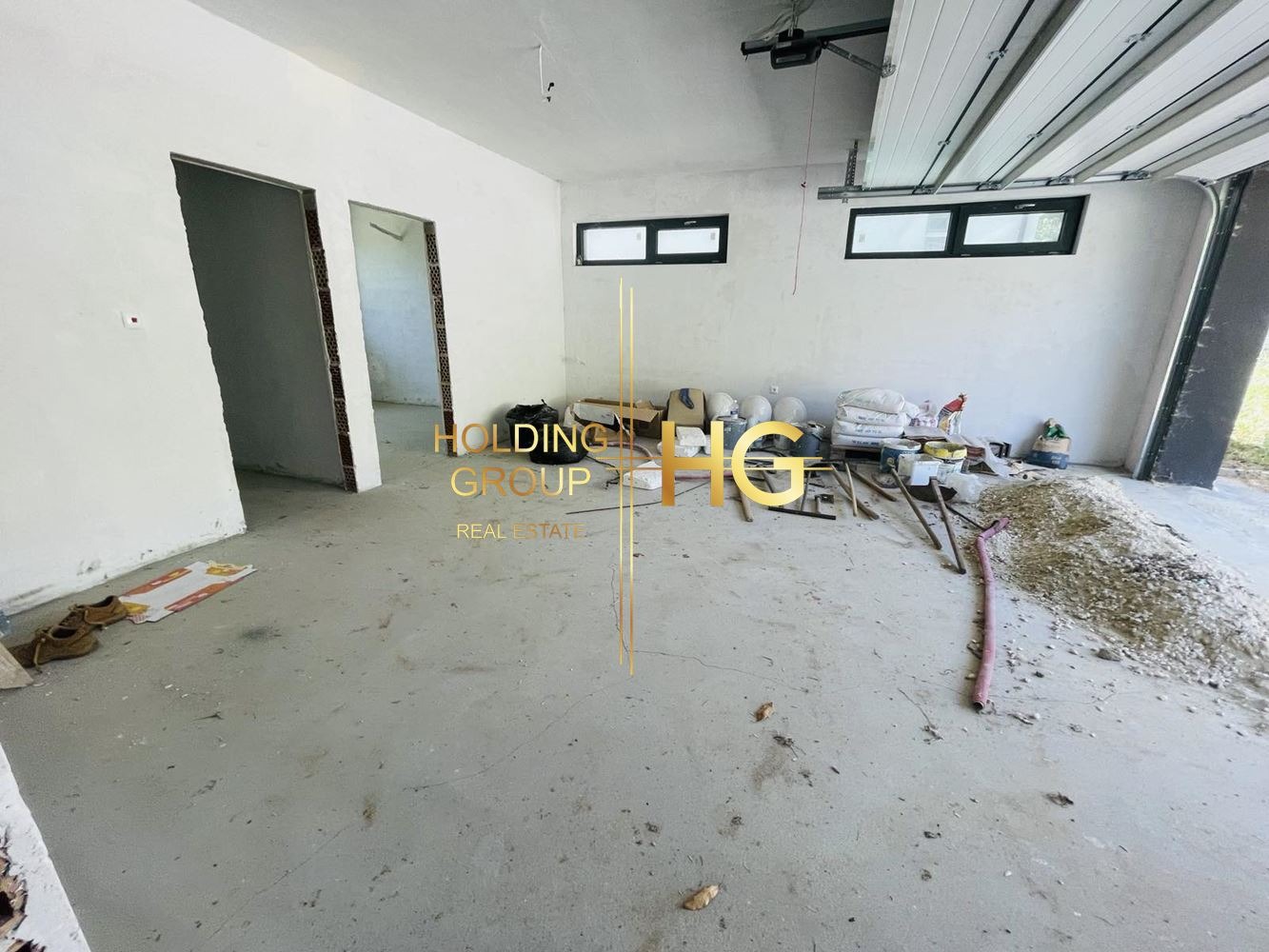 Входната блиндирана врата, както и гаражната секционна врата (с монтирано управление) са също с цвят антрацит.