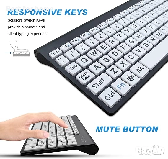 HXMJ - Безжичен комплект клавиатура и мишка с голям шрифт и USB приемник | Тих ножичен превключвател | за възрастни хора и хора с увредено зрение