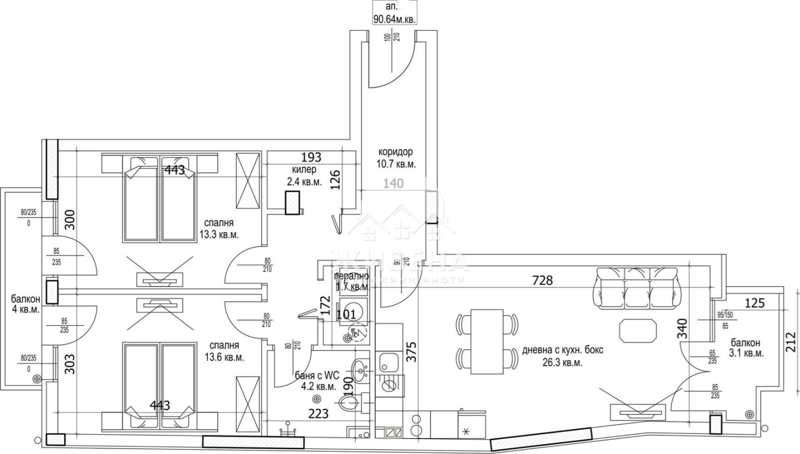 Агенция Живена предлага за продажба тристаен апартамент в малка жилищна сграда, в строеж, разположена на отлично място в Цветен квартал. Имотът е разположен на етаж 3 от 7, с обща площ - 103.56 кв.м, ЗП: 90.64 кв.м, с изложение: юг/северооизток. Състои се от дневна с кухненски бокс (26.3 кв.м), 2 спални (13.6 и 13.3 кв.м), баня с тоалетна (4.1 кв.м), килер (2.4 кв.м), перално (1.7 кв.м), коридор (10.7 кв.м) и лоджия (3.8 кв.м). Издава се в степен на завършеност по БДС: вътрешни стени - тухла с гипсова мазилка, тавани гипсокартон, под на стаи - циментова замазка, баня - тоалет: под циментова замазка, стени вароциментова мазилка, ел. инсталация: завършена напълно до ключове, контакти, оптичен кабел до апартамент; В и К инсталации: завършени до тапа; изграждане на тръбни връзки за монтаж на климатици, на определени по архитектура места; външна врата блиндирана с облечена декоративна каса; прозорци: висококачествена PVC дограма - 7 камерна с тройни стъклопакети, 6 мм четири сезона/ 4 мм бяло флоатно стъкло/ 4 мм К. Възможност за покупка на открити и закрити паркоместа на цени от 25 000 евро. Сградата е с модерна визия и се състои от 7 жилищни етажа и 1 подземно ниво (закрит паркинг). Започнат строеж - през март 2025, очакван Акт 16 - през лятото на 2027 г. Общи части на сградата: подови настилки и стъпала от гранитогрес или гранит; стени - декоративна мазилка; асансьор - ORONA; паркинг - шлайфан бетон на под; фасада - комбинация от мазилка с камък, HPL и керамика; покрив - хидро и топлоизолация. В сградата са налични и други тристайни апартаменти и един четиристаен мезонет. Предлагат се определени схеми на плащане след оставен депозит. Агенция Живена извършва необходимите проверки на имота, който сте избрали, организира всички етапи на сделката до нейното финализиране. Оказваме съдействие за отпускане на банков кредит. Оферта 7488