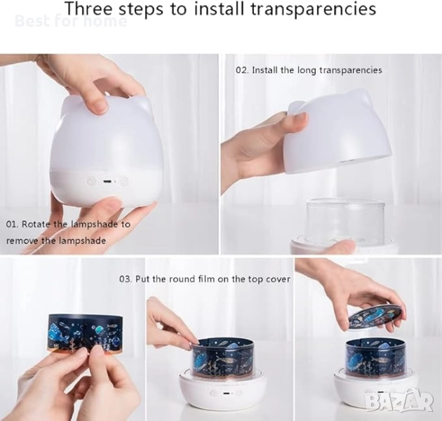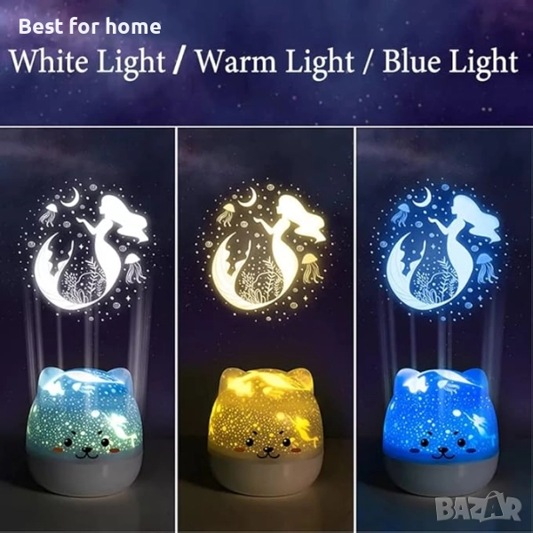 Три режима на работа за нощен проектор - Режим A, Включване и изключване на светлината. Режим B, Превключване между цветови опции и включва сини/лилави звезди върху жълтите. Режим C, Включва опцията за въртене и кара звезди и луна да се въртят на тавана и стената.