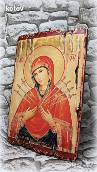 Репродукция на Чудотворната икона на Света Богородица Седмострелна - предпазва от магии и уроки, защитава от завист, злоба и недоброжелателни помисли, прогонва злите духове. Иконата е позната още с наименованията си "Богородица със седемте стрели" и „Успокоение на злите сърца”. На изображанието Божията майка е изобразена със стрели символизиращи страданията на Исус Христос и от друга страна всички човешки пороци и раздори, които пронизват сърцето на Небесната Майка, като предизвикват състрадание и молитва. Иконата предпазва от от магии, пази от негативни мисли и предава нуждата на душата от милосърдие и търпимост. Молитви се отправят за защита при вражди, за помирение при възникнали семейни, съседски или работни спорове, за подобряване на отношения между роднини, близки и родители и деца, а също и за цялостно смирение, състардание и милосърдие. С молби към иконата на Света Богородица Седмострелна се прибягва и при враждуващи държави, с молба за защита от нападения и надежда за смекчаване на злите сърца. Пред иконата се молим за изцеление от телесни или душевни болести, семейно благополучие и щастие.