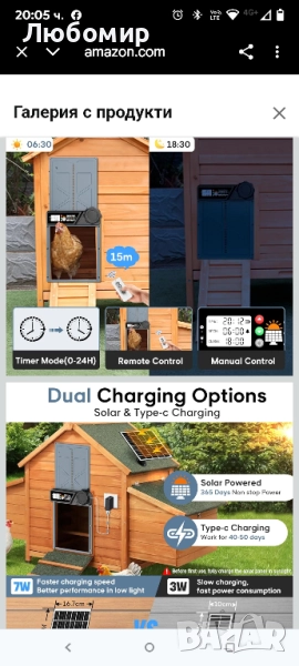 кокошарник с голям размер, захранвана от слънчева енергия - Автоматично отваряне на врата за кокошки, режими на таймер за безопасно и удобно отглеждане на кокошки с интелигентни сензори за препятствия, дистанционно управление, 36,2 см В x 27,3 см Д.Ефективна работа със слънчева енергия] Нашата автоматична врата за кокошарник разполага с мощна вътрешна литиева батерия с голям капацитет, която може да се зарежда бързо чрез високопроизводителния 7W соларен панел или включения USB-C кабел. Няма нужда да се притеснявате за времето, прекъсванията на захранването или труднодостъпните контакти – насладете се на удобството на безпроблемното автоматично отваряне и затваряне. Забележка: Преди първа употреба, заредете напълно вратата с 5V/2A адаптер, преди да свържете соларния панел.