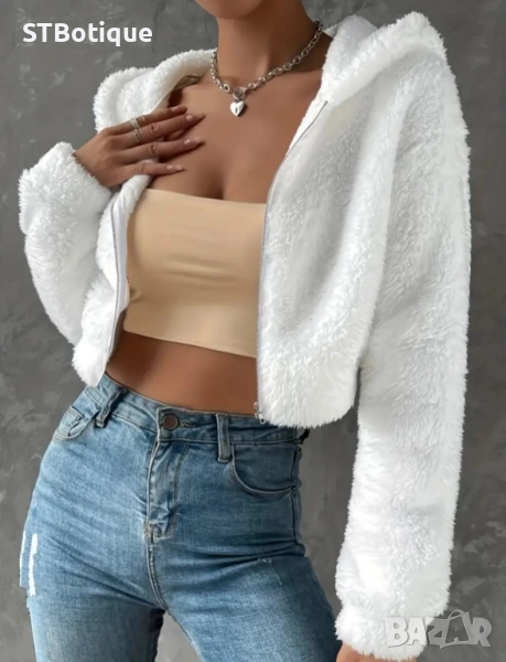 🧥 Черно/Бяло плюшено дамско палто с качулка – STBoutique → Обява 51938079