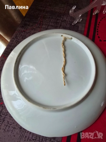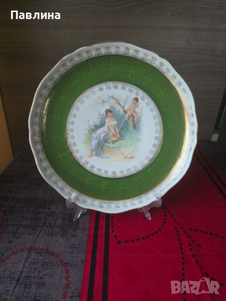 “Купидон в атака” - невероятно красиво декоративно, английско плато от около 1975 г, сцена от любовната митология с много злато, млечно зелени цветове и безспорна красота, диаметър Ф 24.5 см цена 35 лв , великолепие и класа, леко износване на външния златен кант, отлично качество на изработка. Няма маркировка!