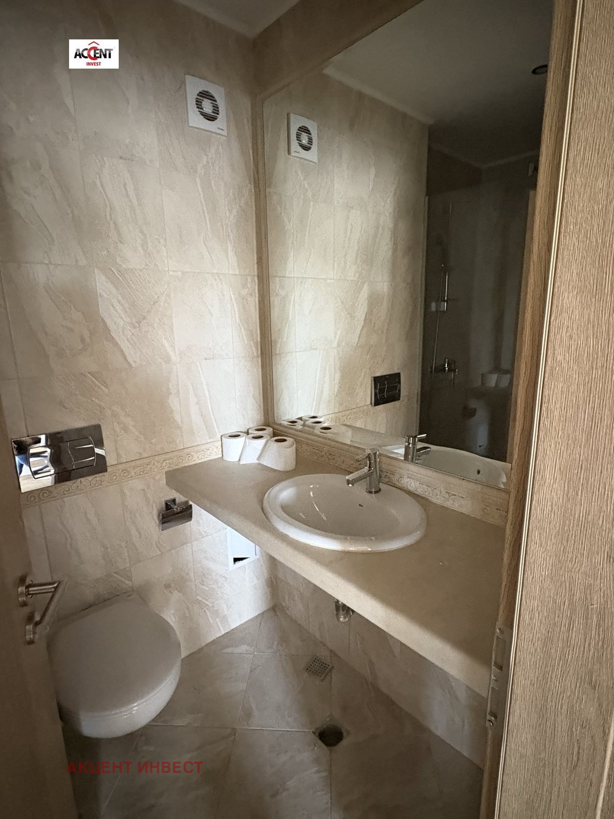Баня и тоалет - напълно завършени с испански фаянс и теракота; санитарен фаянсIdeal Standard и арматура Vidima, плот от естествен камък.