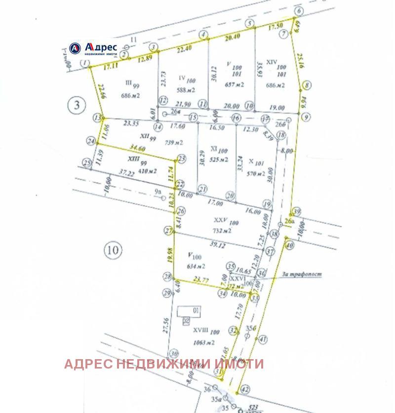 Парцел. Адрес недвижими имоти продава парцел с ПУП за построяване на комплекс от девет самостоятелни къщи. Имотът се намира на северният склон на селото, с южно изложение, в близост до боровата гора. Тихо място с чист въздух, в едно от най-близките села до град В.Търново. Имотът е подходящ за закупуване от инвеститор за построяване на 'мини' селище в населеното място.