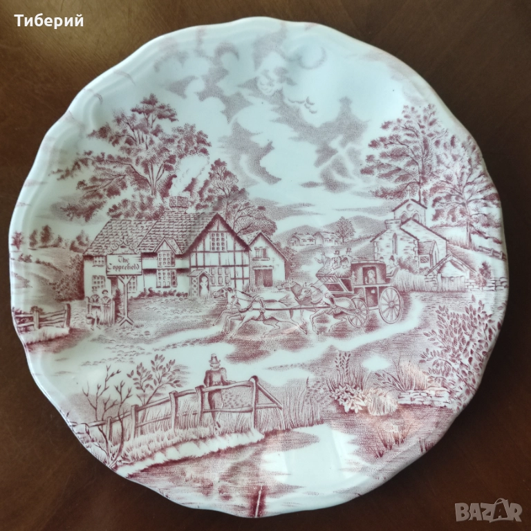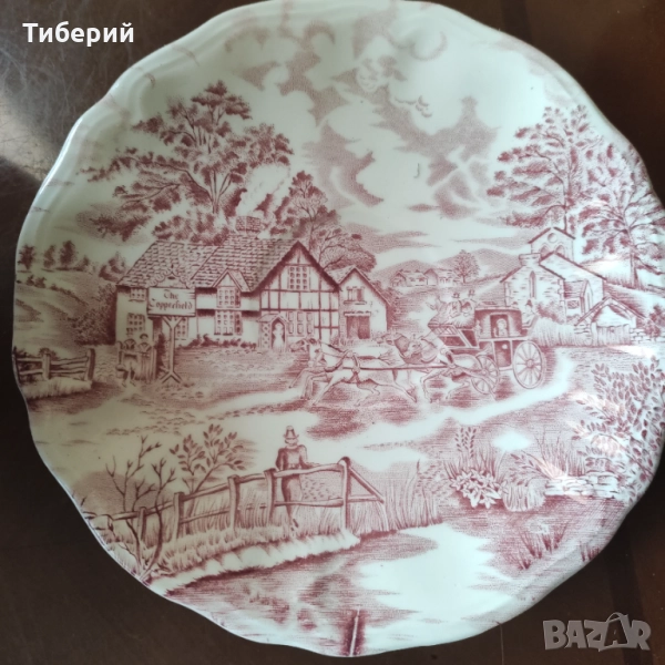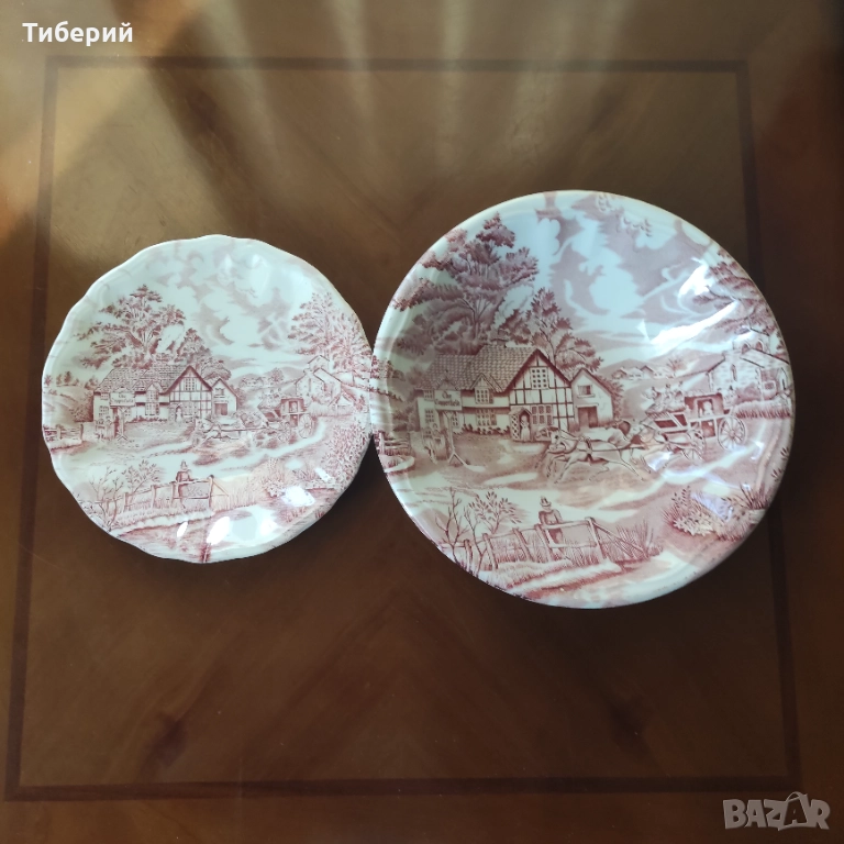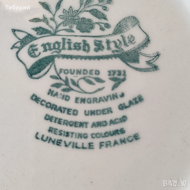 Порцеланови прибори Luneville, Франция в червено и бяло, английски стил. 50-те години, ръчно рисувани, подглазурни цветове устойчиви на препарати и киселини, щамповани на дъното.
