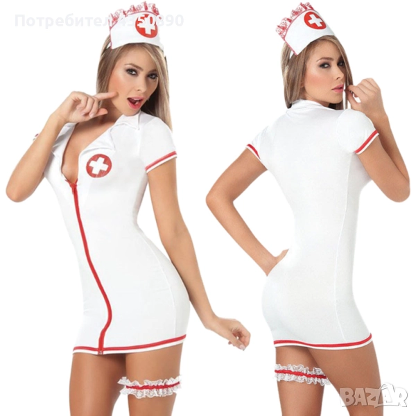 Съблазнителен еротичен костюм на медицинска сестра. Секси костюмът се състои от четири части - еластична рокля с цип, мини прашки, диадема с касинка и 1 бр. еластична дантела аксесоар за крак. Материята е мека на допир и изключително еластична. Костюмът е подходящ за подарък за всеки специален повод или за разнообразяване на интимния живот. Не е тайна, че сексуалният живот при дългите връзки се нуждае от постоянно разнообразяване, а какво по-хубаво от това да започнете с малките промени в облеклото? Еротичните игри са изключително подходящо забавление. Класическият образ на палава медицинска сестра присъства във всички мъжки фантазии. Искате да се забавлявате с партньора си? Харесвате да опитвате нови неща? Тогава този секси костюм на медицинска сестра е точно за вас. Секси костюмът се състои от четири части - еластична рокля с цип, мини прашки, диадема с касинка и 1 бр. еластична дантела аксесоар за крак.