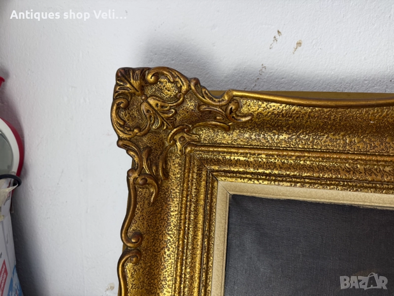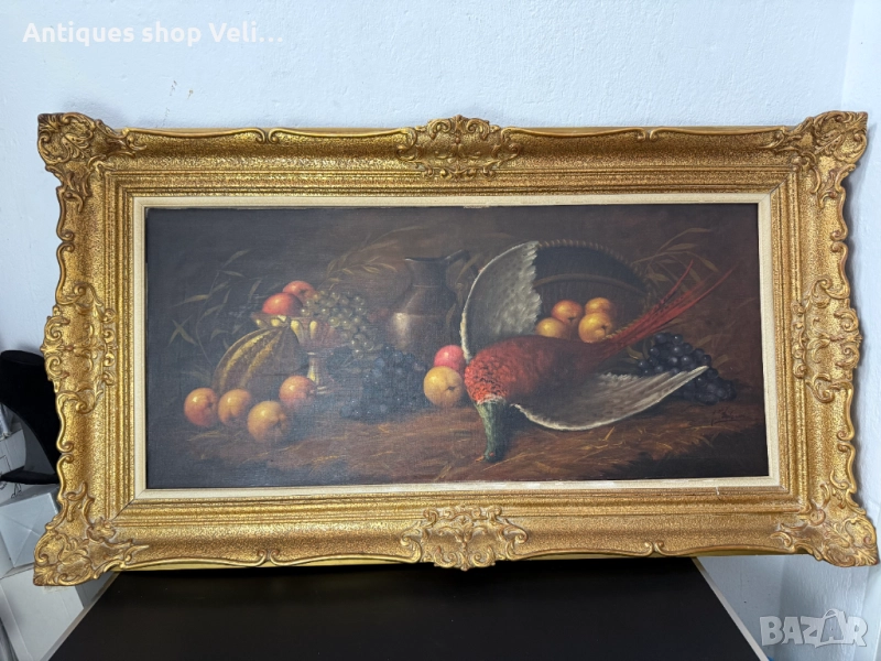 Голяма авторска картина натюрморт с дървена масивна рамка в златист цвят. Добро състояние. Предлагаме доставка с Еконт и лично предаване за градовете Велико Търново, Русе и Сливен!