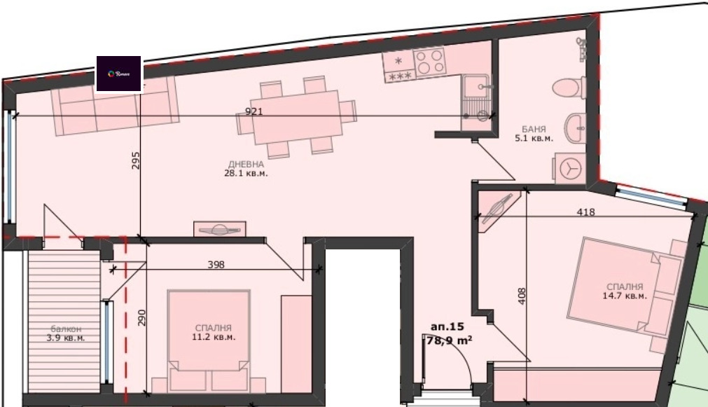 Апартаментът ще се състои от просторна дневна с кухнески бокс (28.1кв.м.), първа спалня (14.7кв.м.), втора спалня (11.2кв.м.), баня с тоалетна (5.1кв.м.) и балкон (3.9кв.м.).